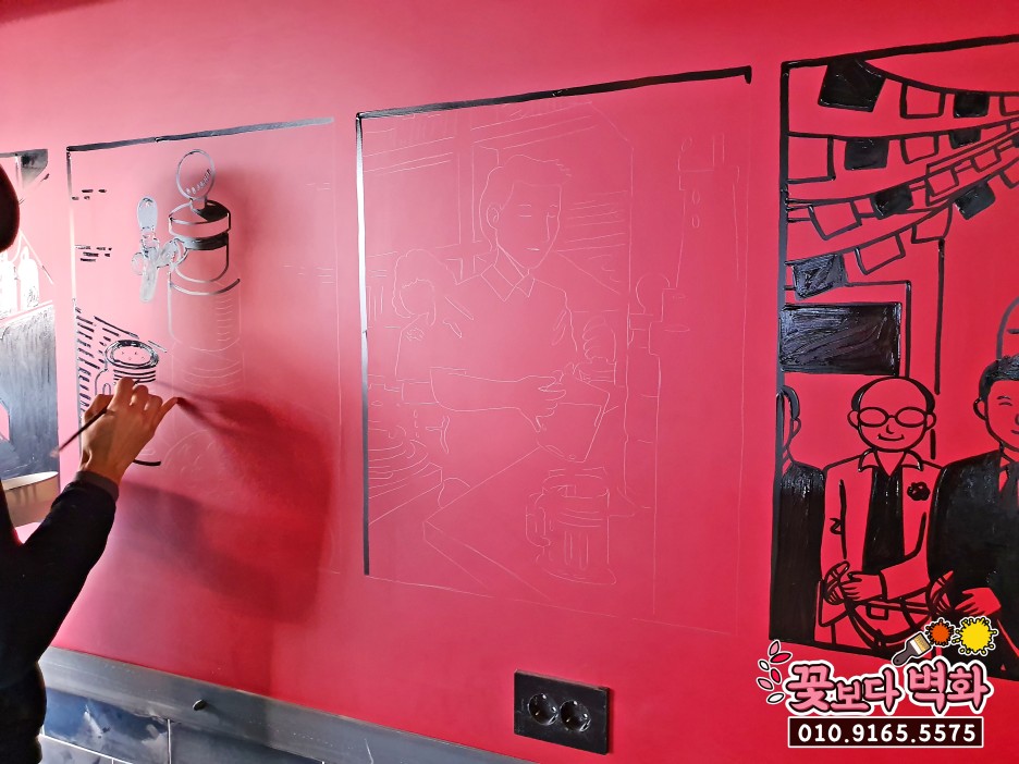 레드, 블랙, 화이트 이 3가지의 색 조합으로 아주 멋진 벽화 가 탄생하였습니다.