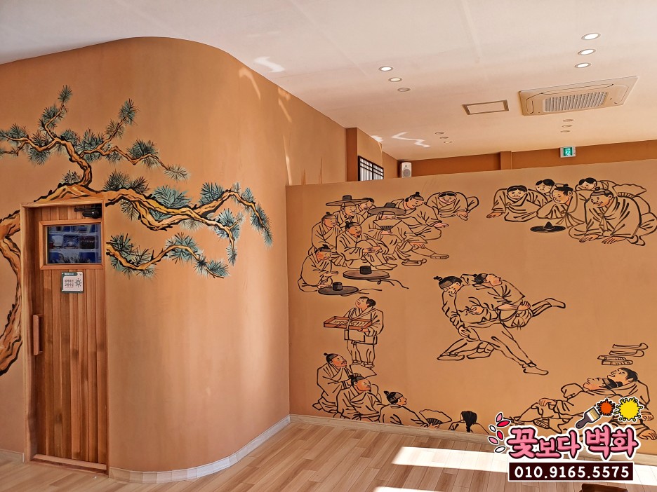 찜질방과 정말 잘 어울리는 벽화가 탄생하였습니다.