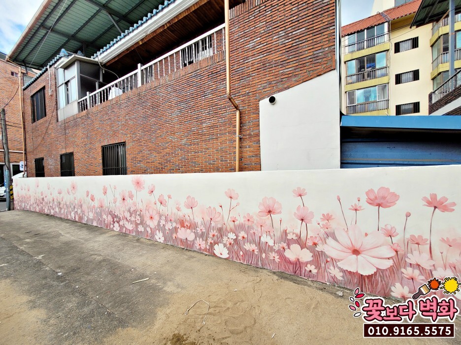 예쁜 코스모스 꽃 그림이 가득한 담벼락 벽화, 마을벽화, 꽃보다벽화