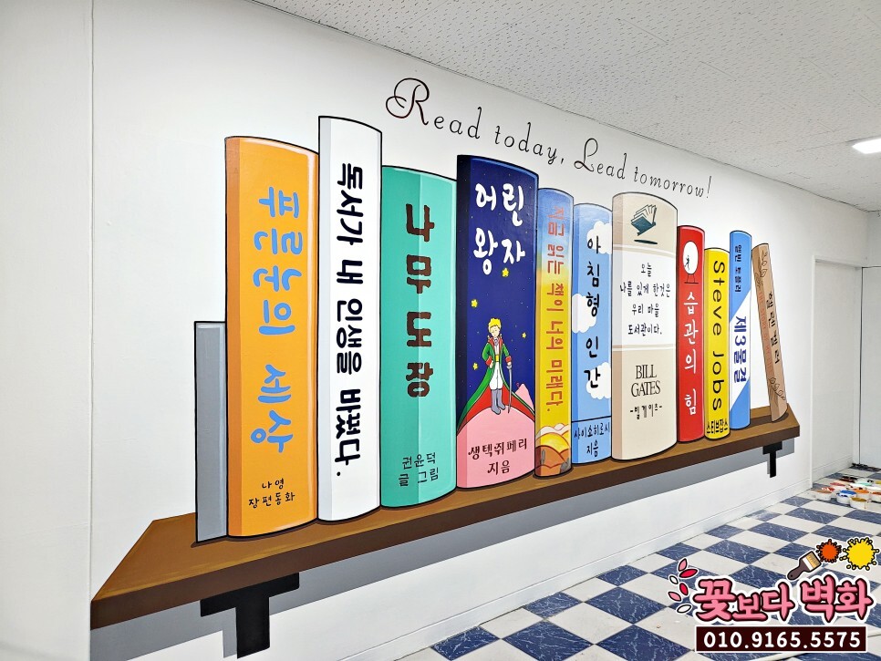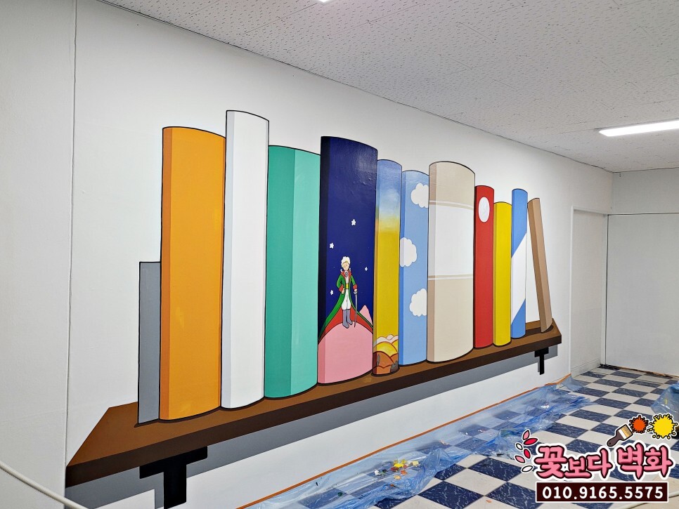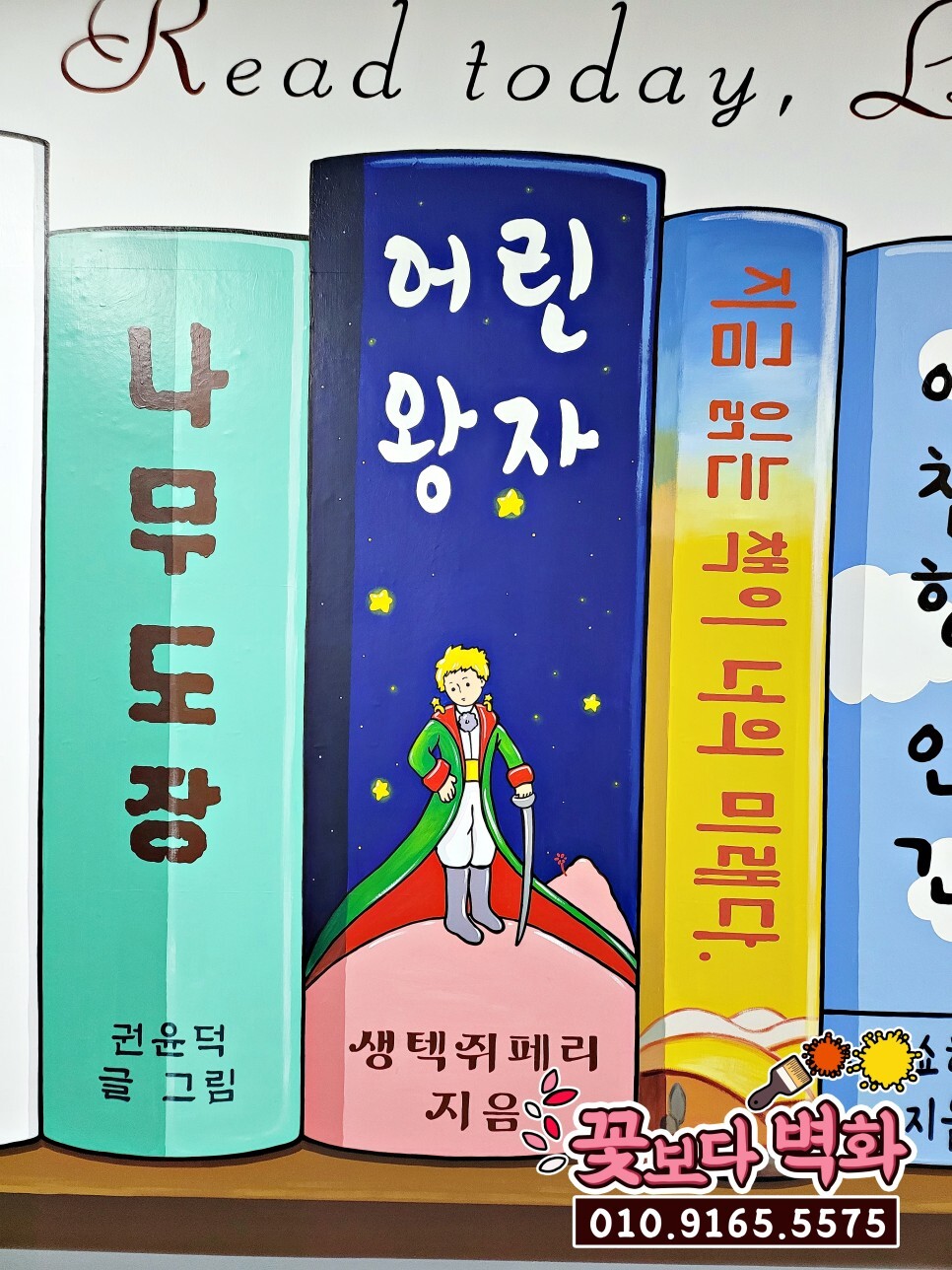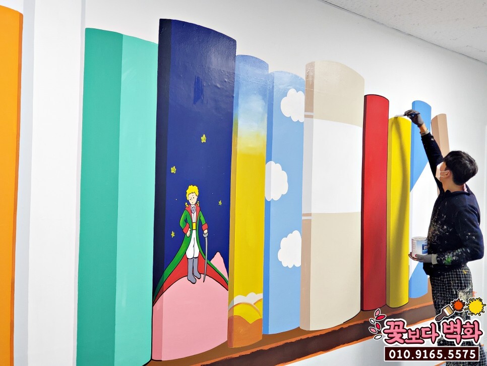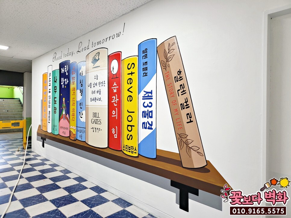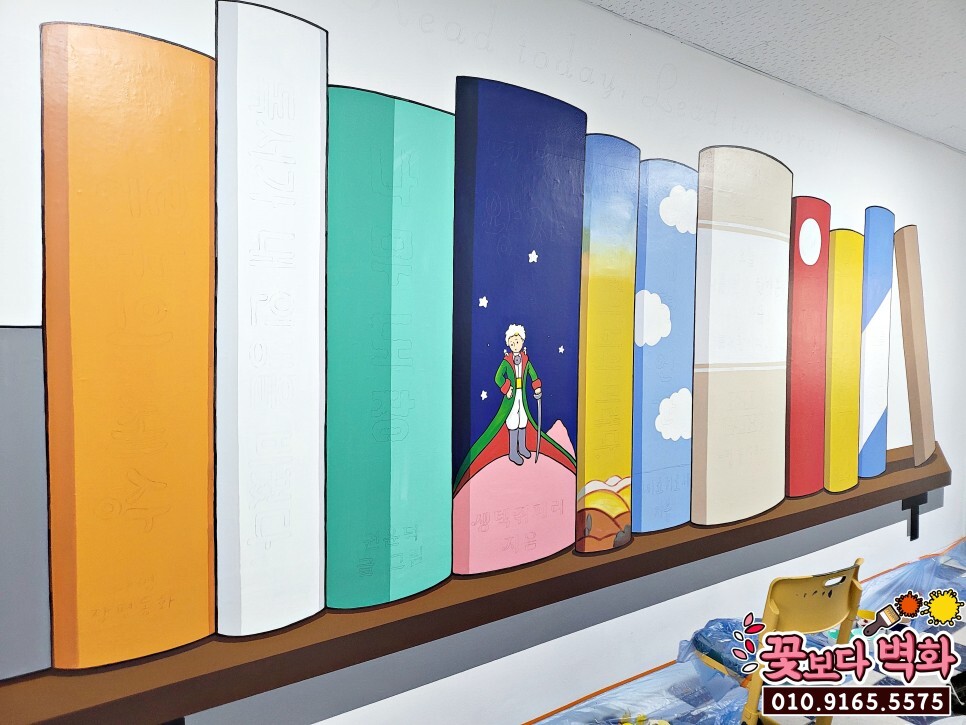 아이들이 많은 책을 읽고 꿈을 키울수 있는 도서관입구 복도에 멋진 책그림을 그려넣고 왔습니다.