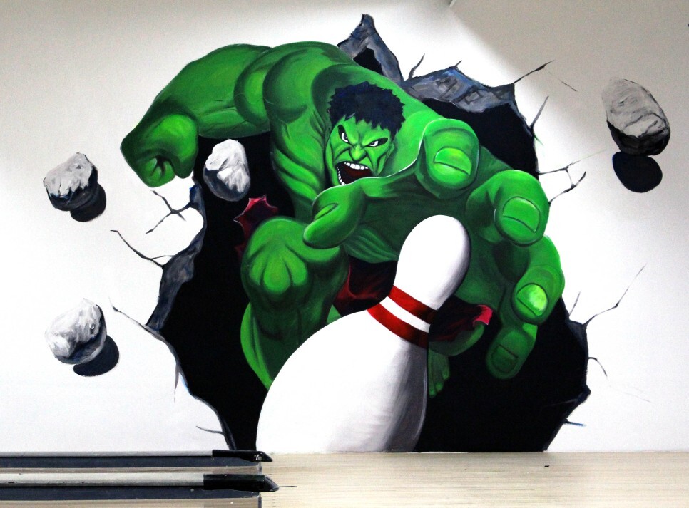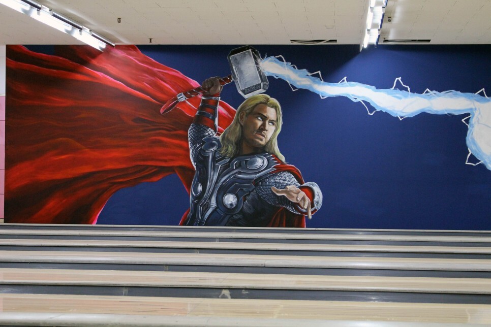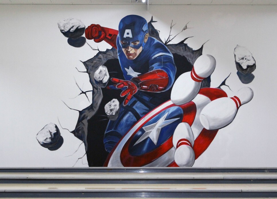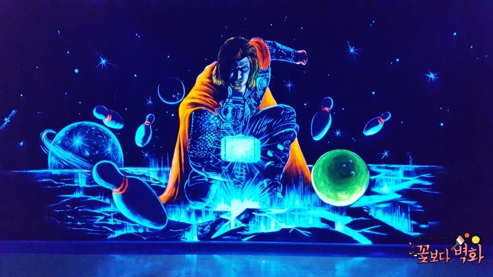 대구 수성구에 있는 볼링장에 그린 어벤져스 캐릭터들이 총집합한 형광 벽화입니다.
