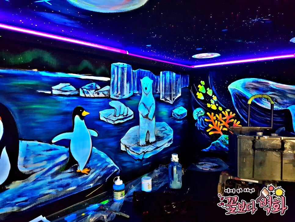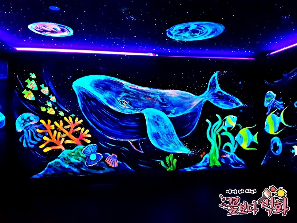 형광벽화는 블랙라이트라는 조명에만 발광하는 특수 안료를 사용해서 그리는 벽화인데요.