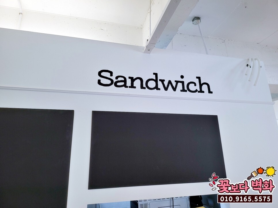 내부 벽면에는 Sandwich 문구가 앞서 보셨던 간판 스텐실과 같은 작업으로 진행이 되고 있는데요.