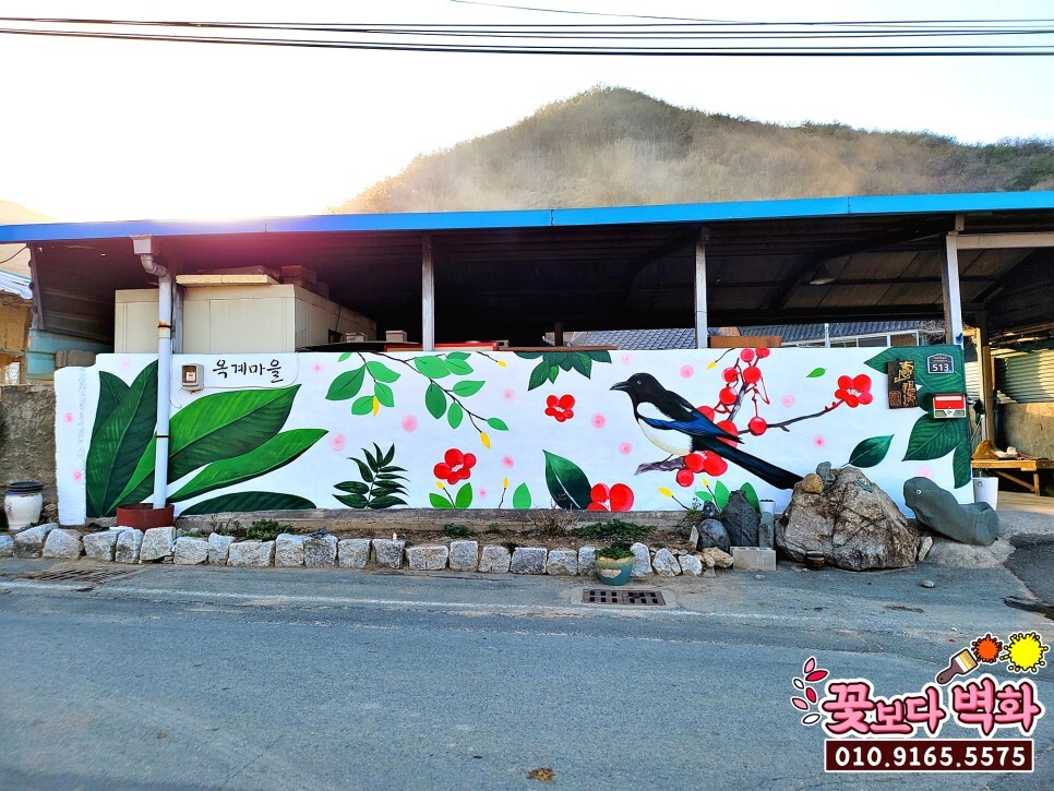 까치와 매화로 마을에 너무나도 잘 어울리는 한국적인 벽화 !