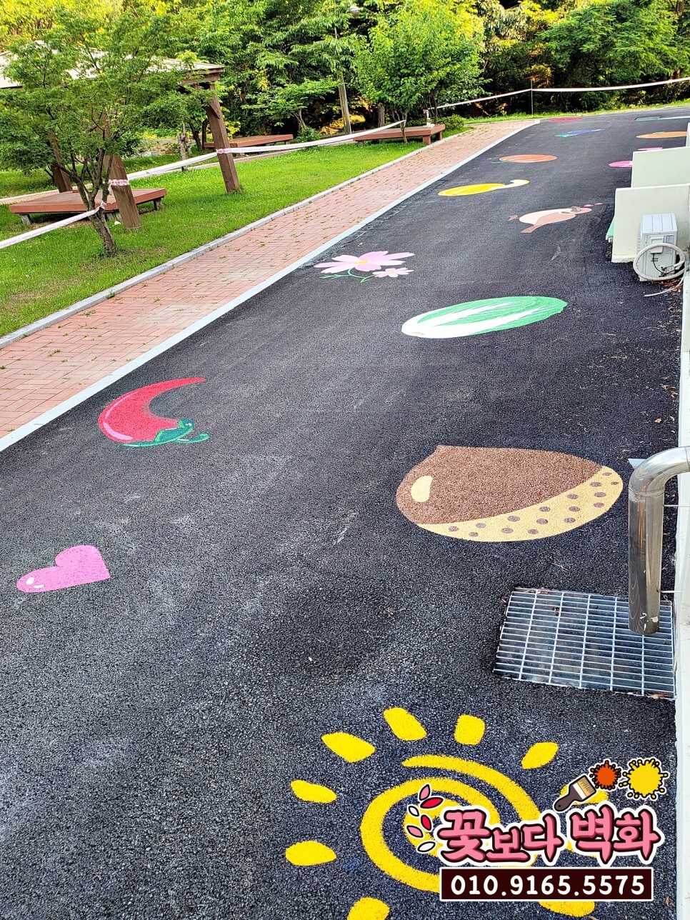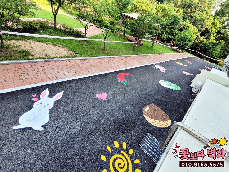 여기에 어르신들이 재미있게 보시면서 산책 하실수 있게 동식물 캐릭터들로 먼저 분필로 스케치작업이