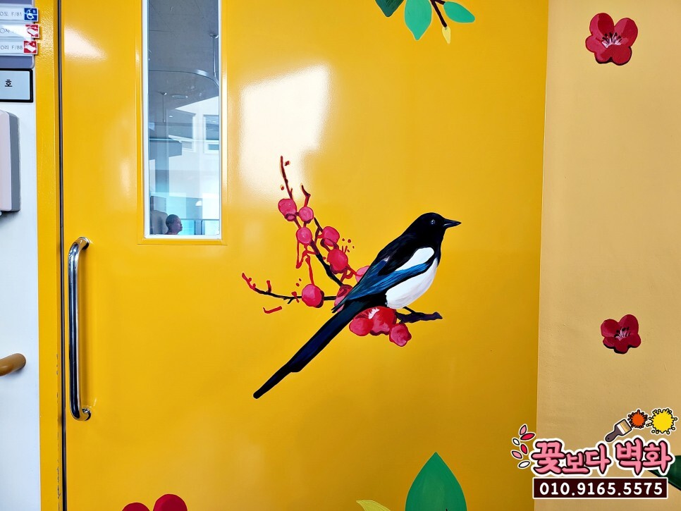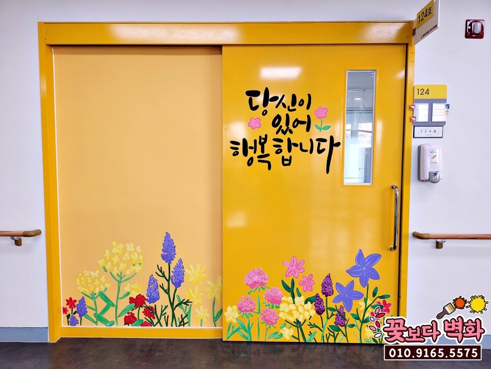 요양병원 내부 병실문에 그려진 예쁜 포인트벽화, 캘리그라피, 꽃그림
