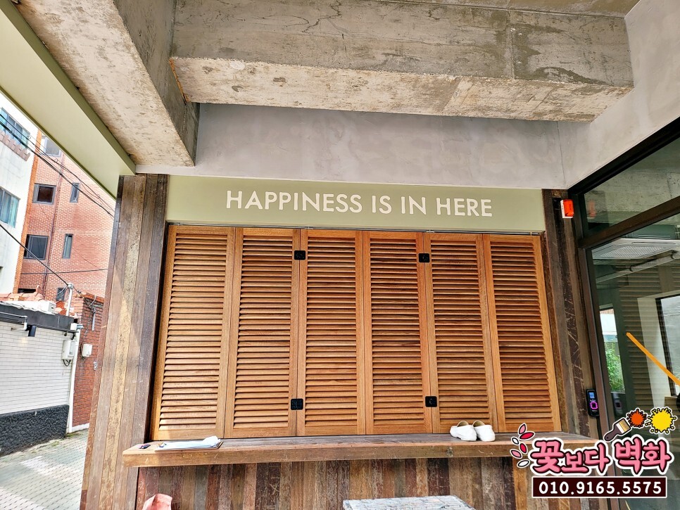 실외 안쪽에도 추가로 HAPPINESS IS IN HERE 문구 스텐실 작업이 이루어졌습니다.