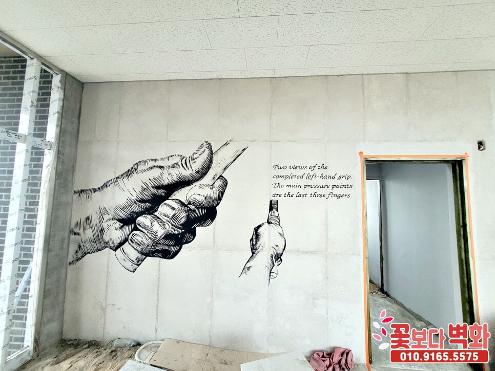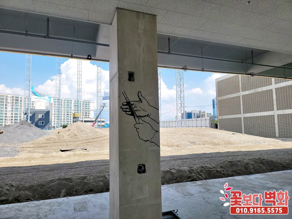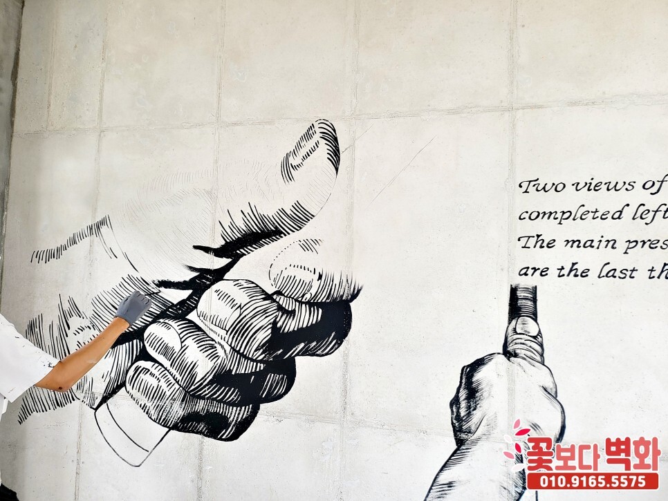 이렇게 콘크리트 벽면에 무채색의 드로잉 느낌으로 벽화가 시공이 되니