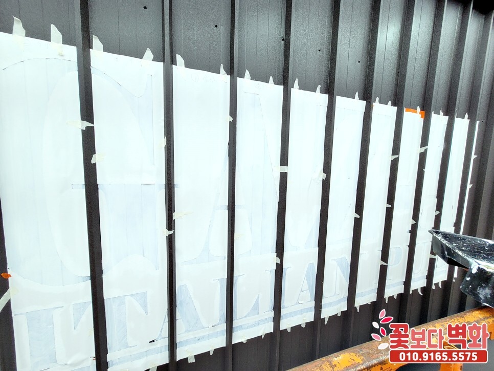 먼저 한쪽 벽면 위쪽에는 가즈아 로고가 스텐실 작업으로 진행되고 있고