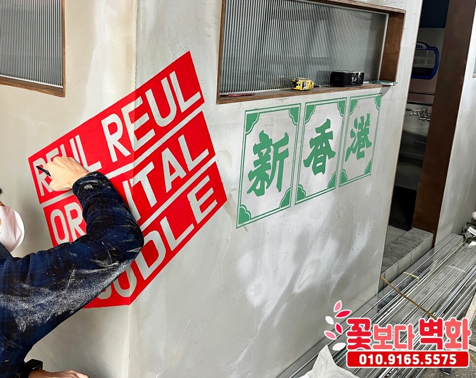 보이는 벽면에 상호 스텐실 작업이
