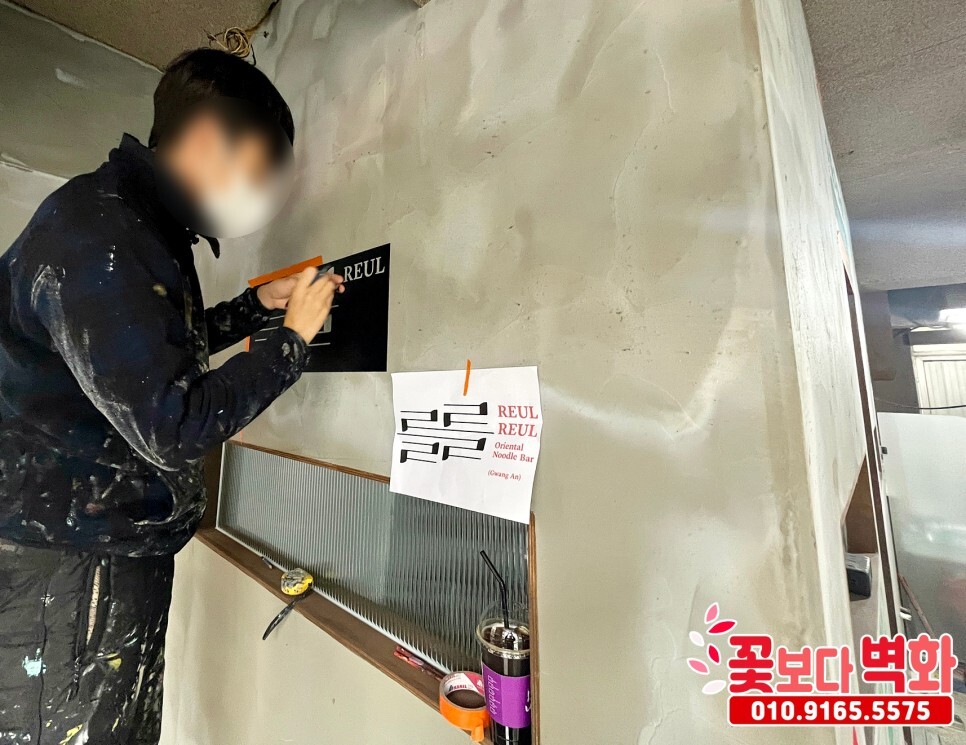‘를를’ 상호 스텐실 작업이 진행되고 있습니다.