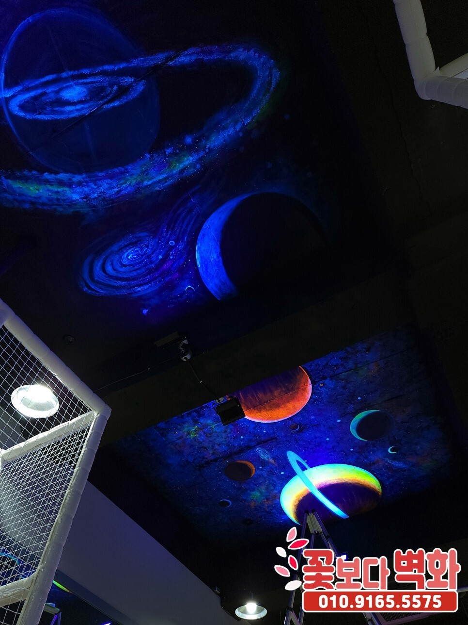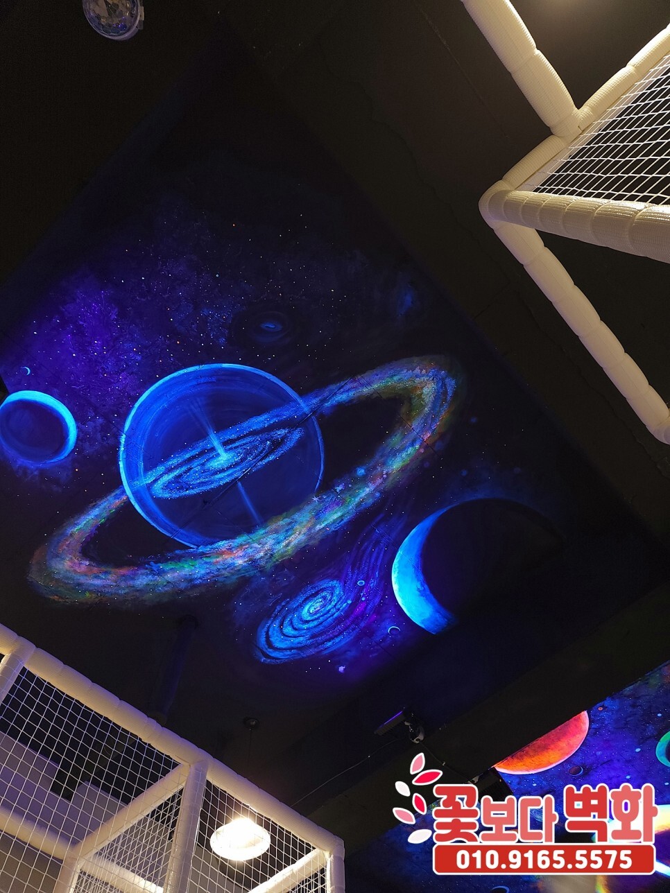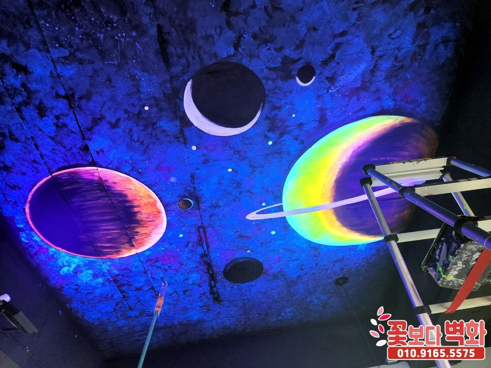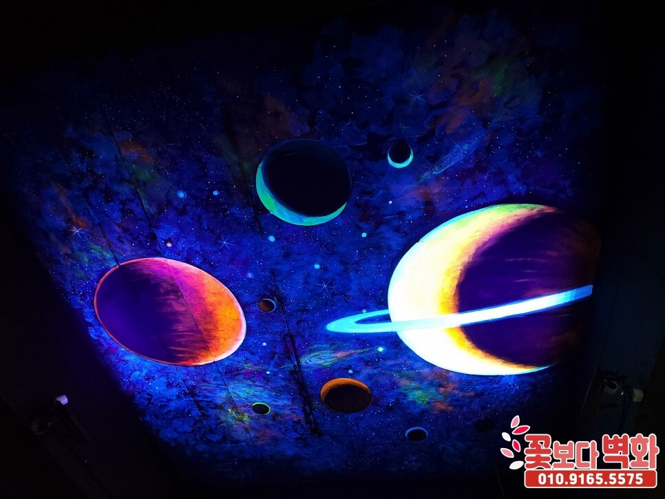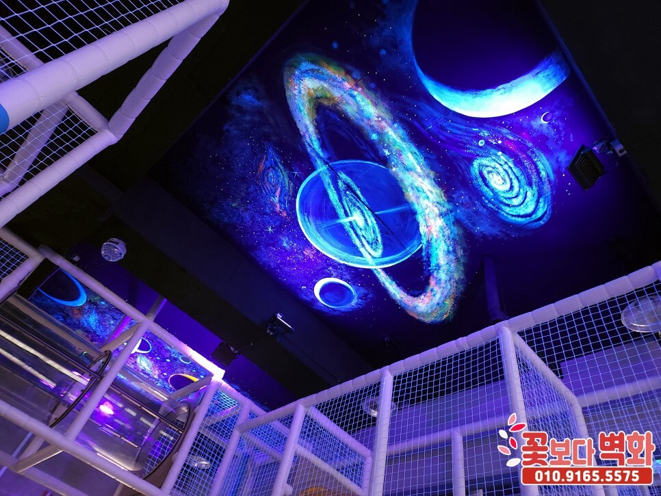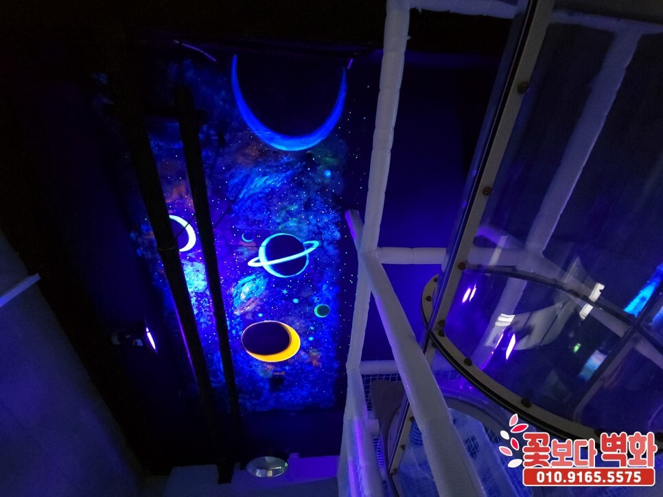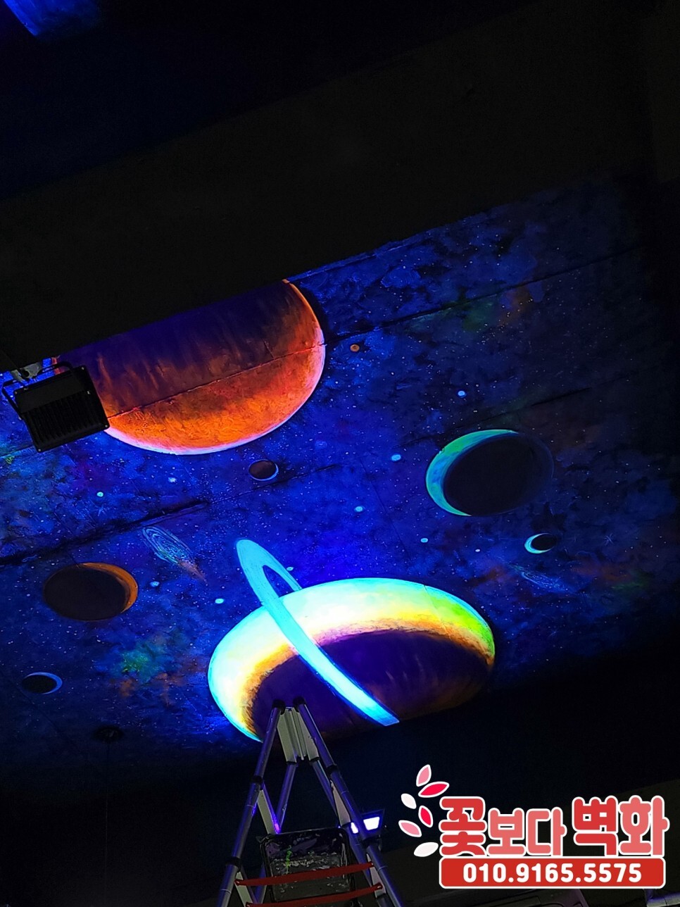 청주시 우리끼리 별빛마을 키즈카페 천장에 작업 된 루미나이트 형광, 야광 인테리어벽화, 고퀄리티 우주느낌