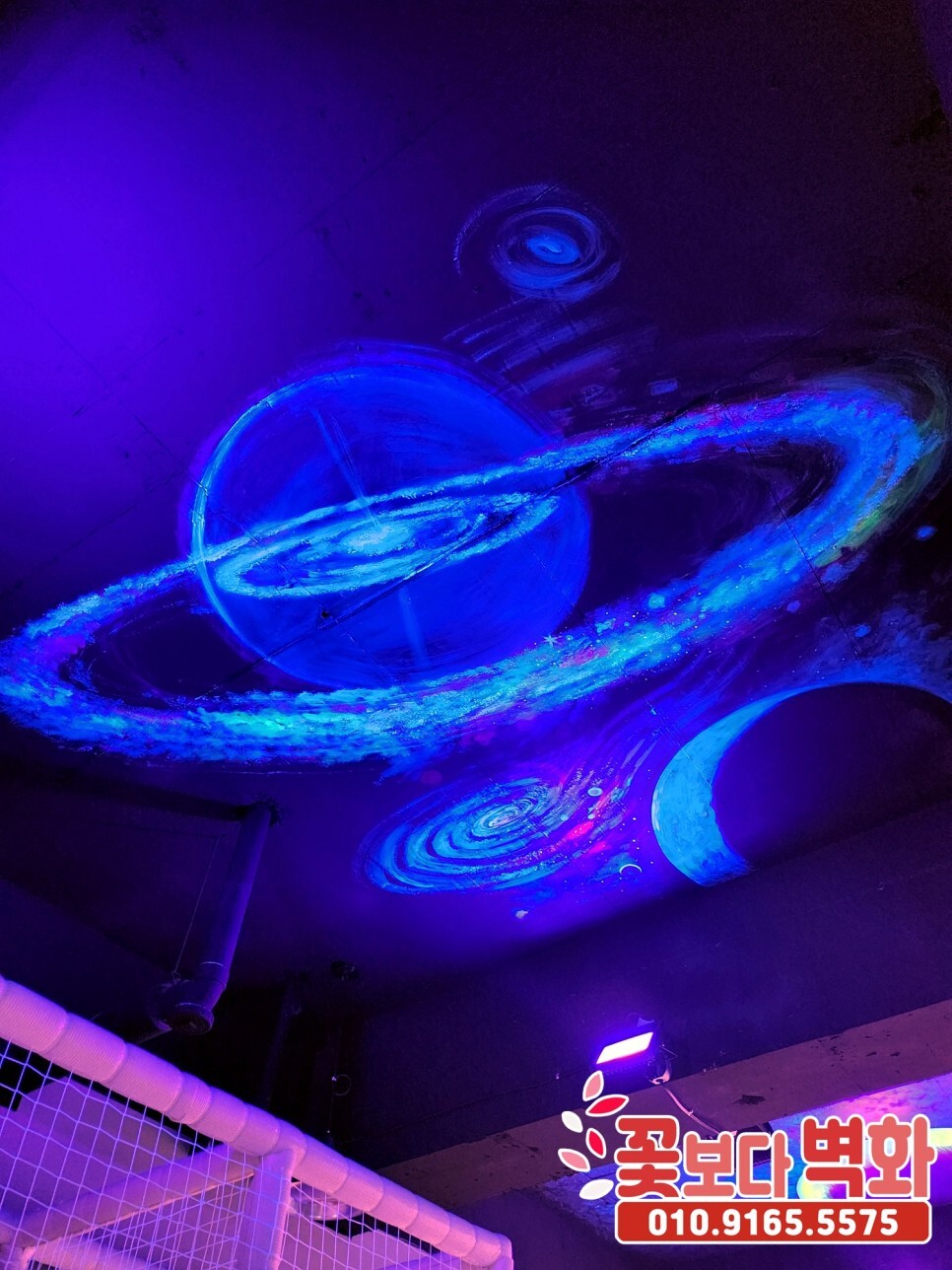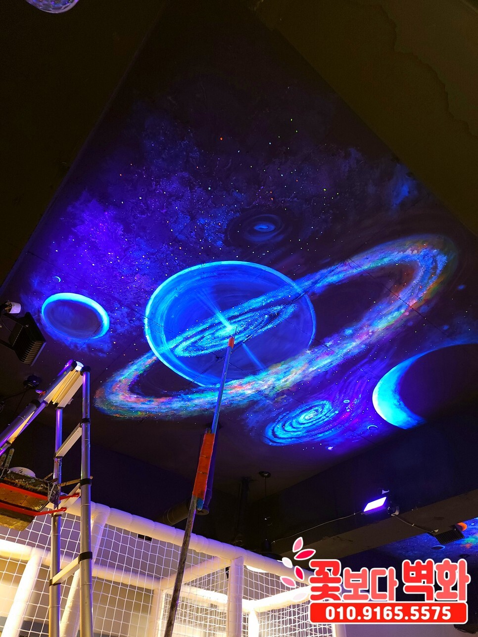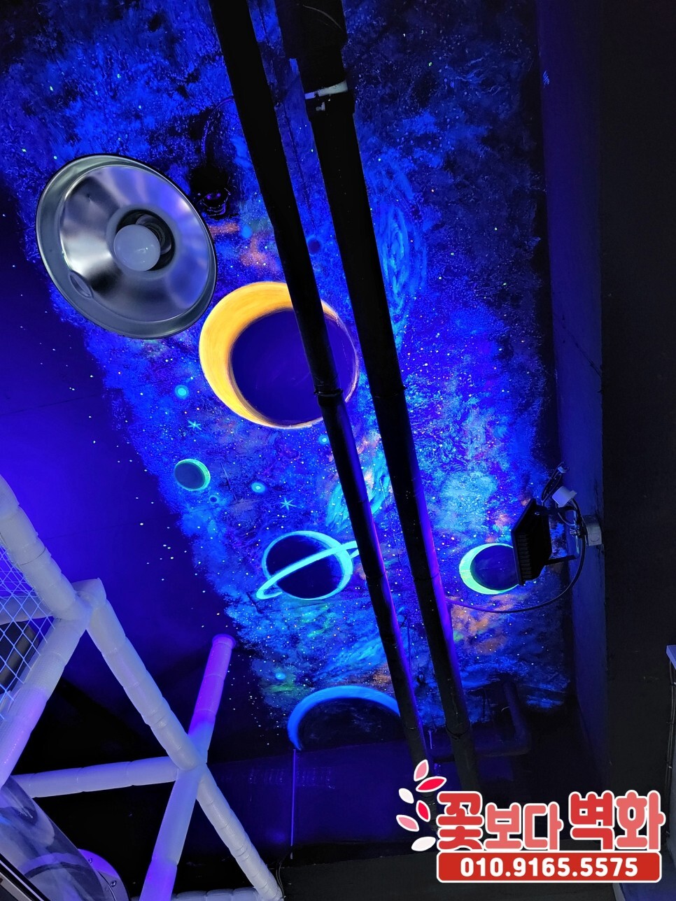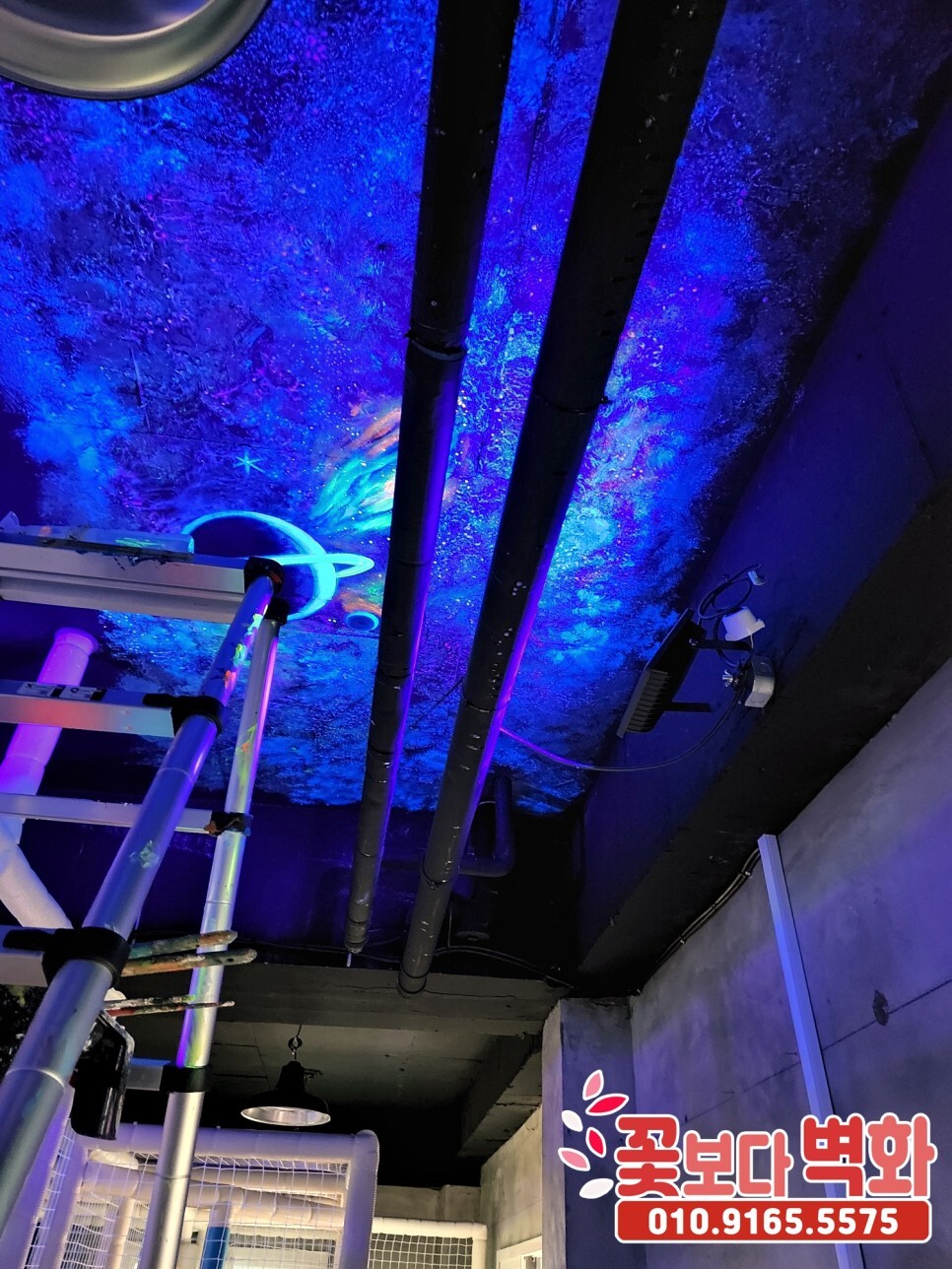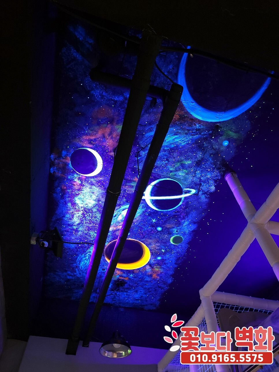 청주시 우리끼리 별빛마을 키즈카페 천장에 작업 된 루미나이트 형광, 야광 인테리어벽화, 고퀄리티 우주느낌