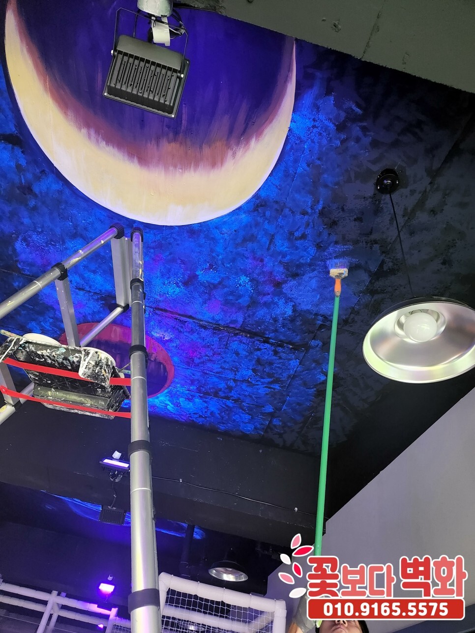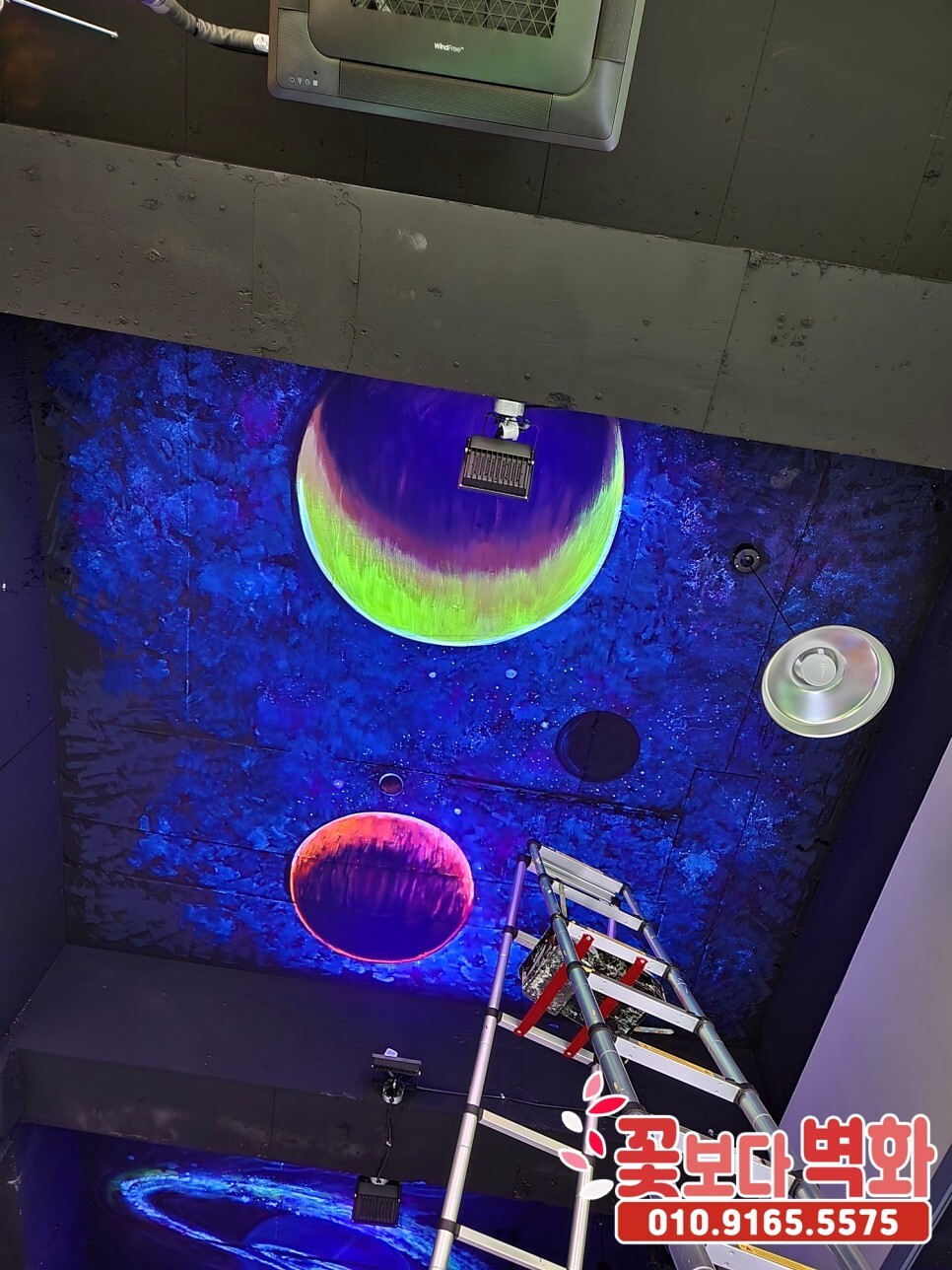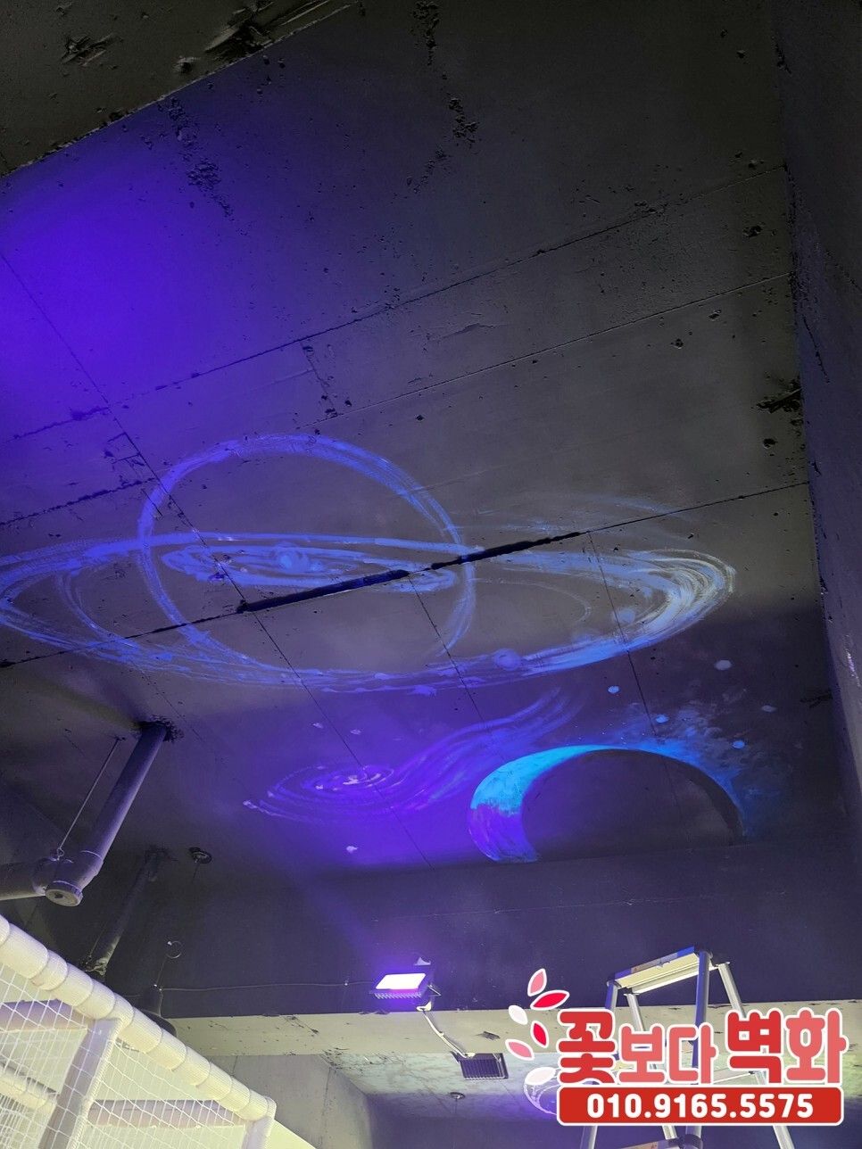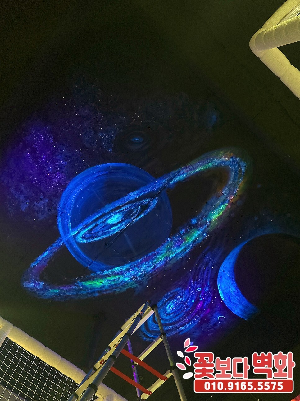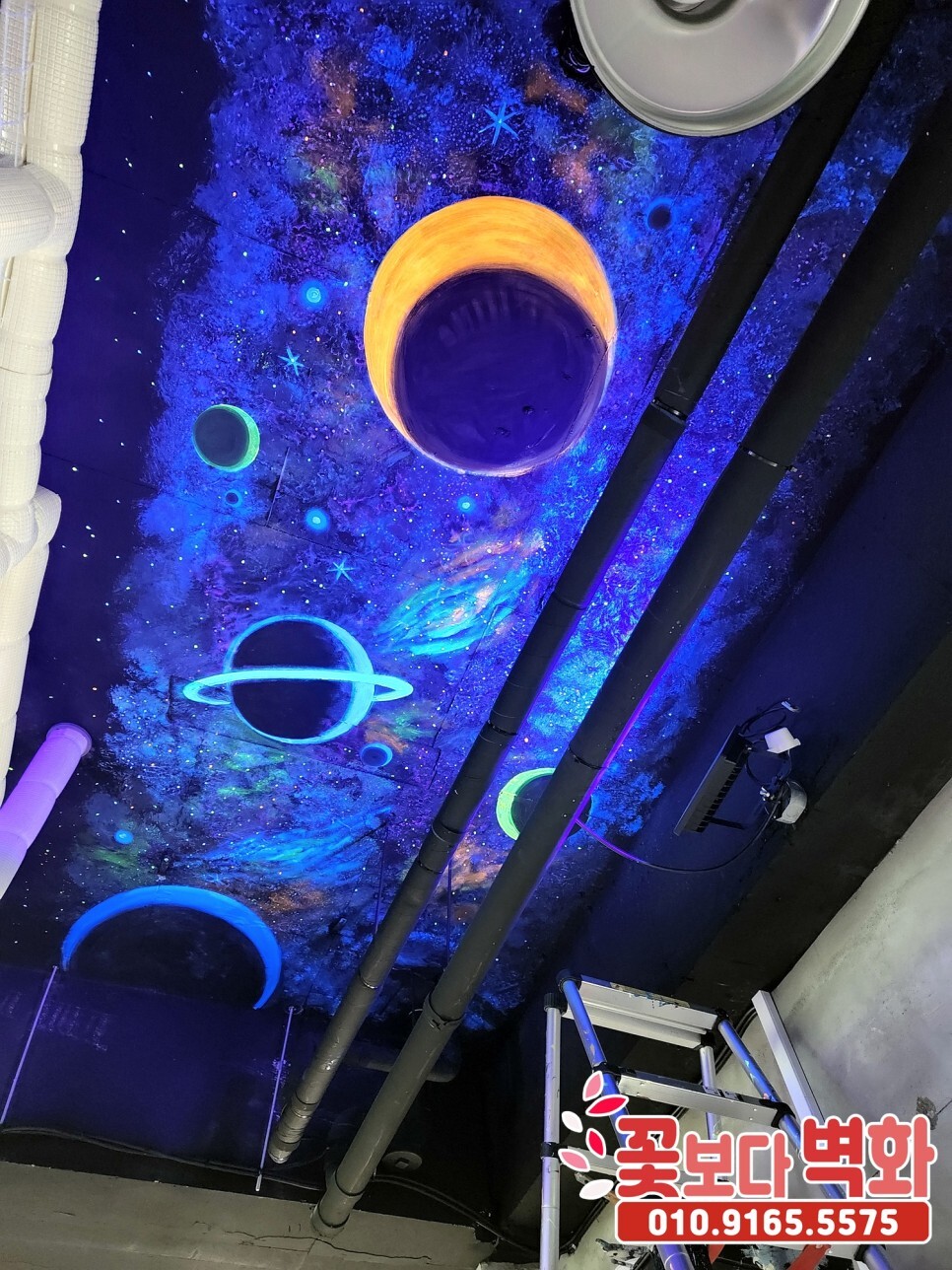 청주시 우리끼리 별빛마을 키즈카페 천장에 작업 된 루미나이트 형광, 야광 인테리어벽화, 고퀄리티 우주느낌