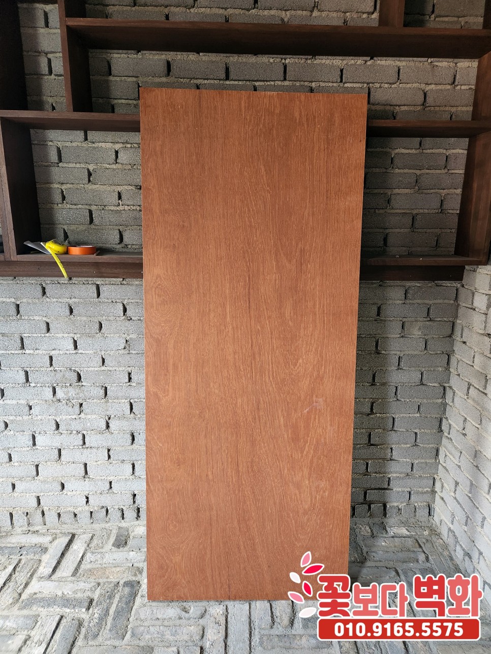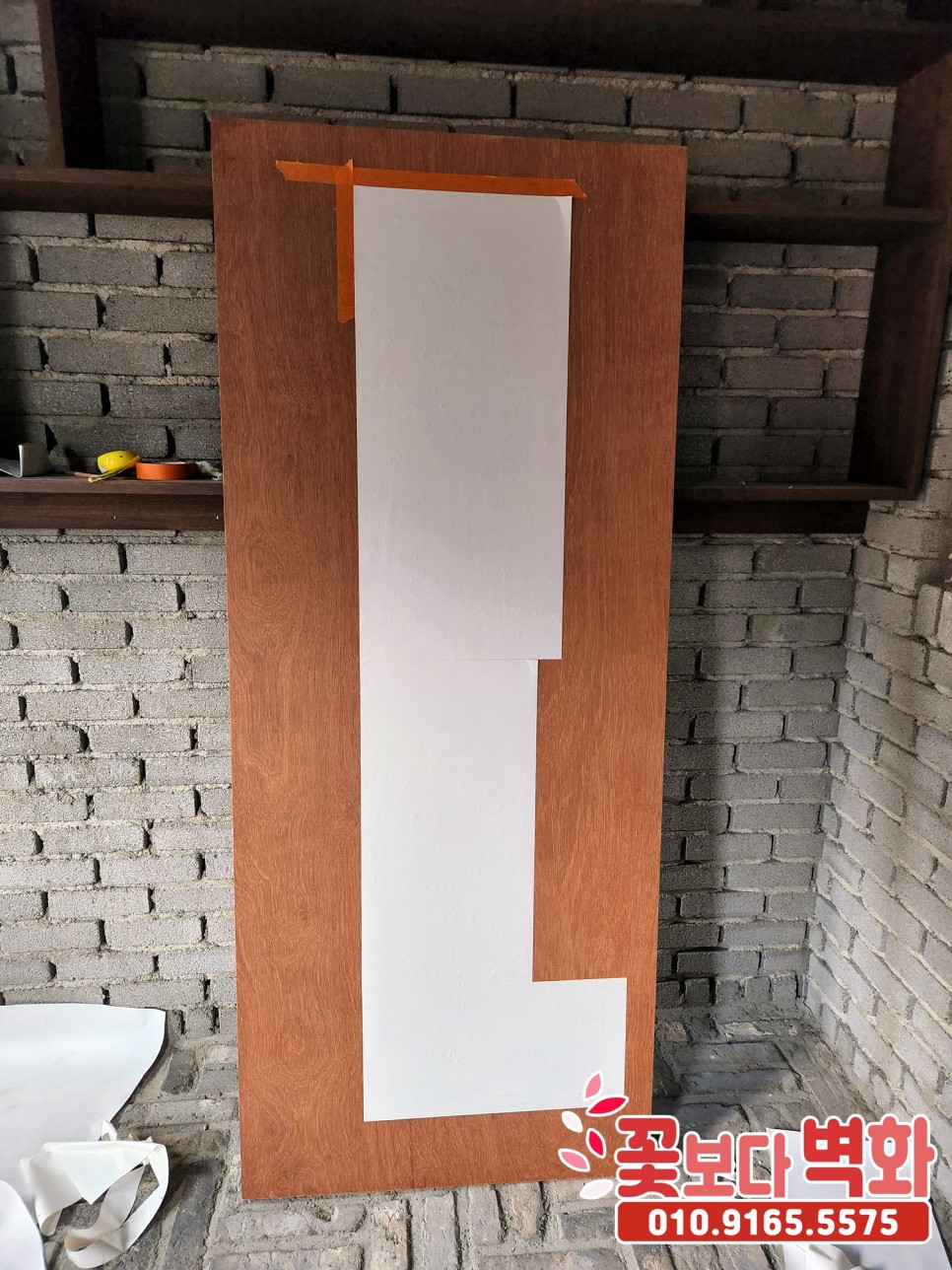 꽃보다벽화에서 미리 준비해온 시트지를 나무 간판에 붙인 다음,