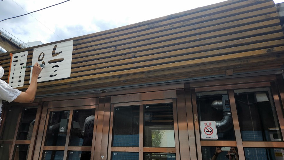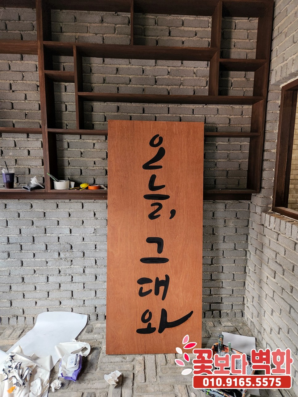 먼저 나무 간판에 '오늘 그대와' 가게 상호 스텐실 작업이 시작되었습니다 :)