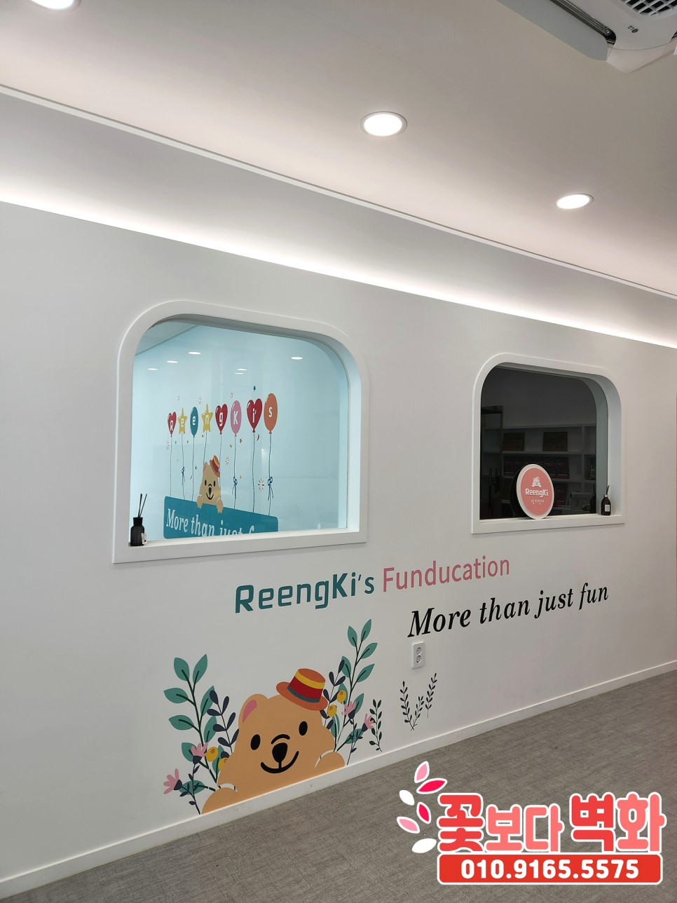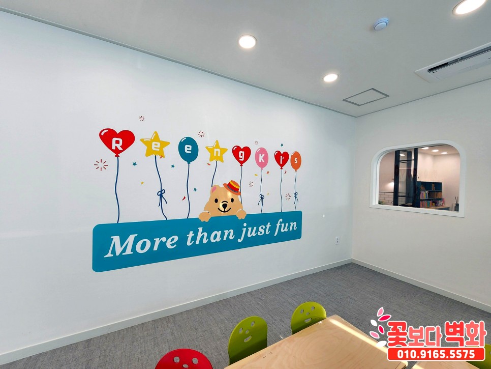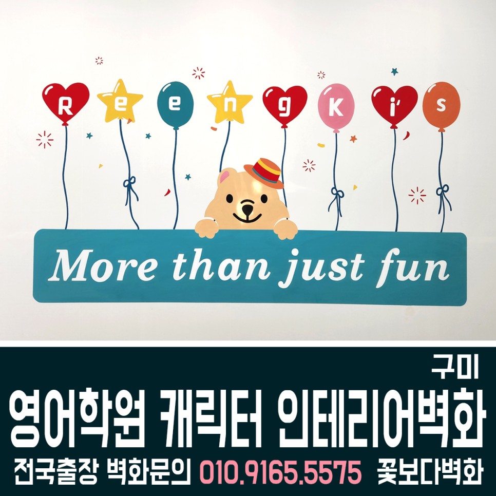 구미 영어학원 내부에 그려진 캐릭터 인테리어 벽화/ 로고, 깔끔한 포인트 벽화