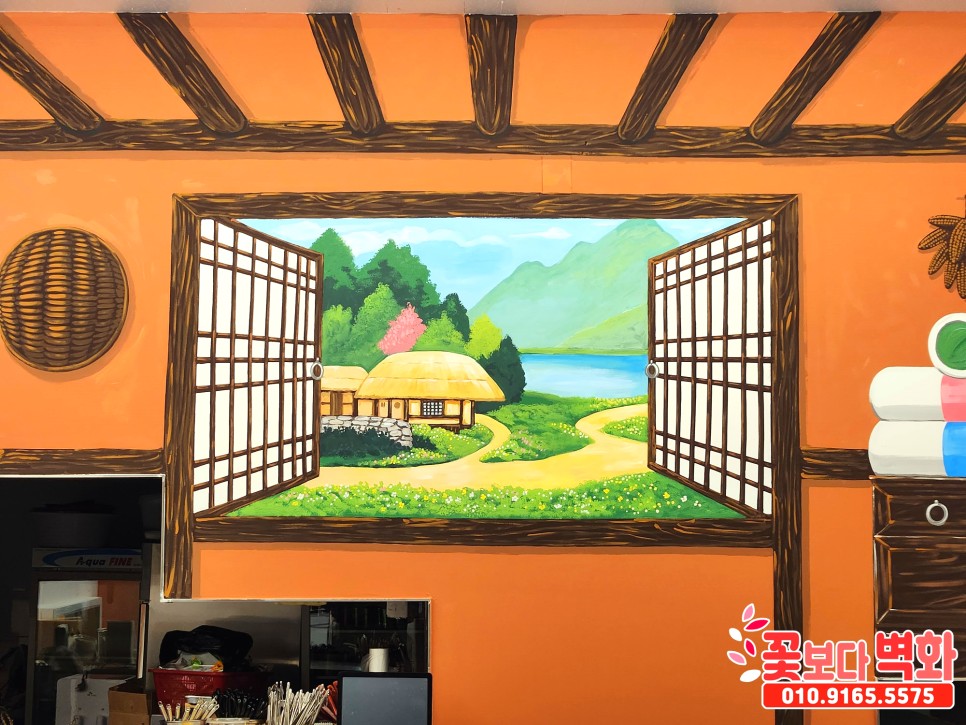 저희 꽃보다벽화는 전면과 기둥을 초가 풍경으로 예쁘게 꾸며보겠습니다 :)