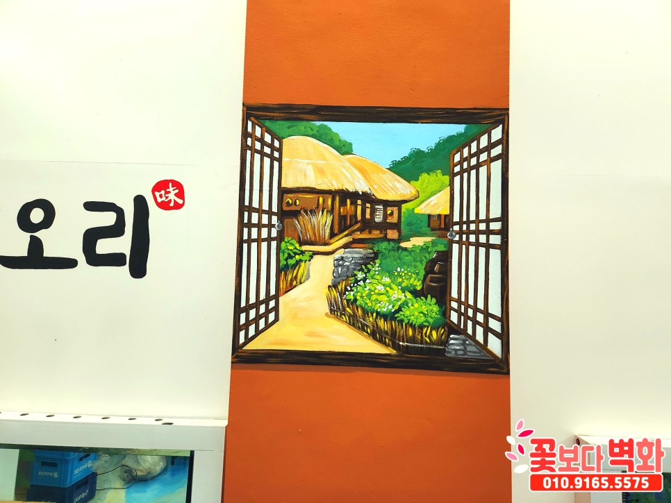 동탄 최상오리고기, 초가집 컨셉으로 꾸며진 내부 인테리어벽화/ 옛날풍경, 초가풍경, 복고인테리어