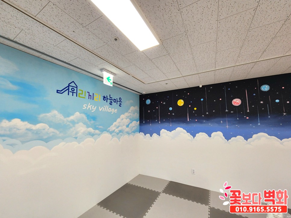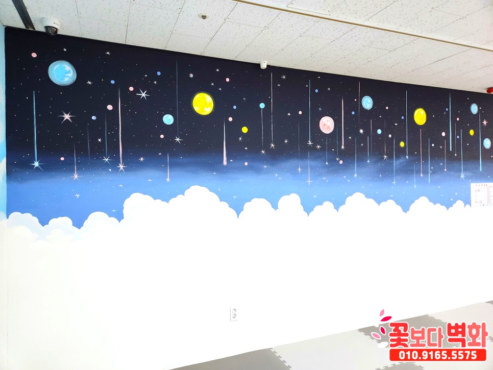 낮과 밤 하늘컨셉으로 그려진 키즈카페 인테리어벽화, 꽃보다벽화, 동화벽화