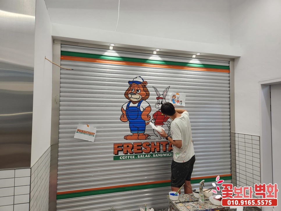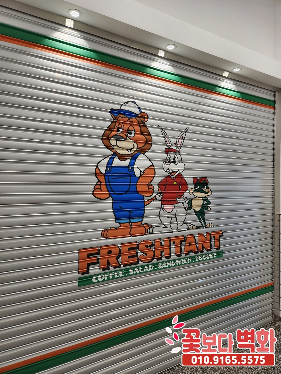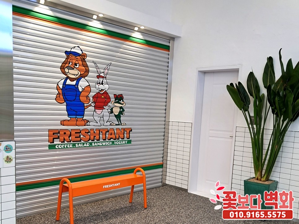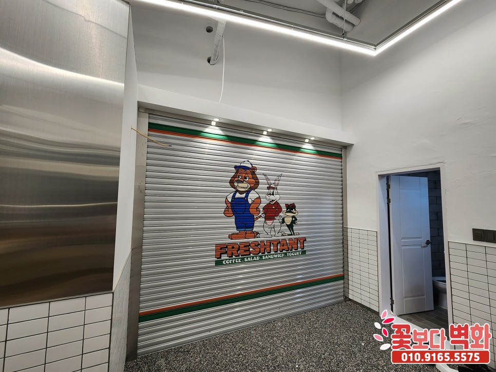 창원 프레시턴트 카페, 셔터에 그려진 로고 스텐실 인테리어벽화 / 로고벽화제작, 깔끔한 포인트벽화