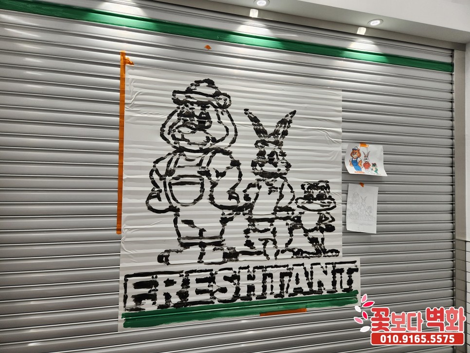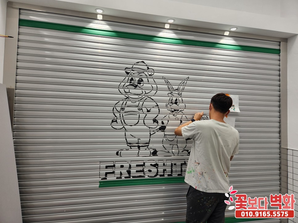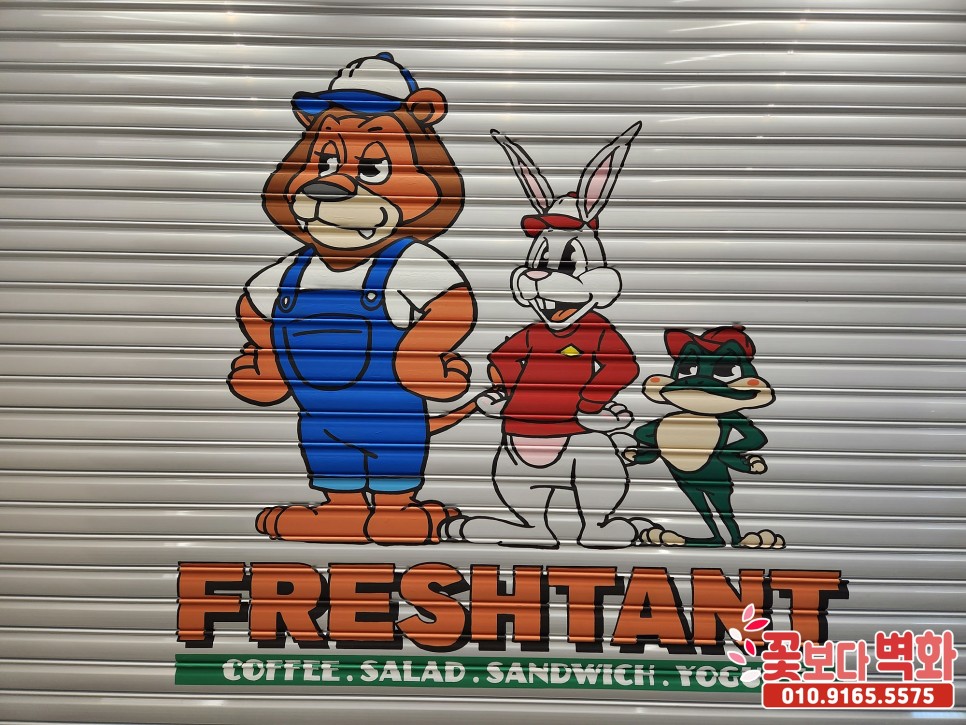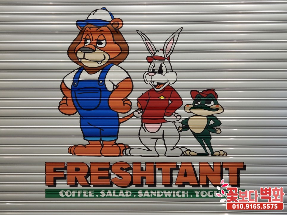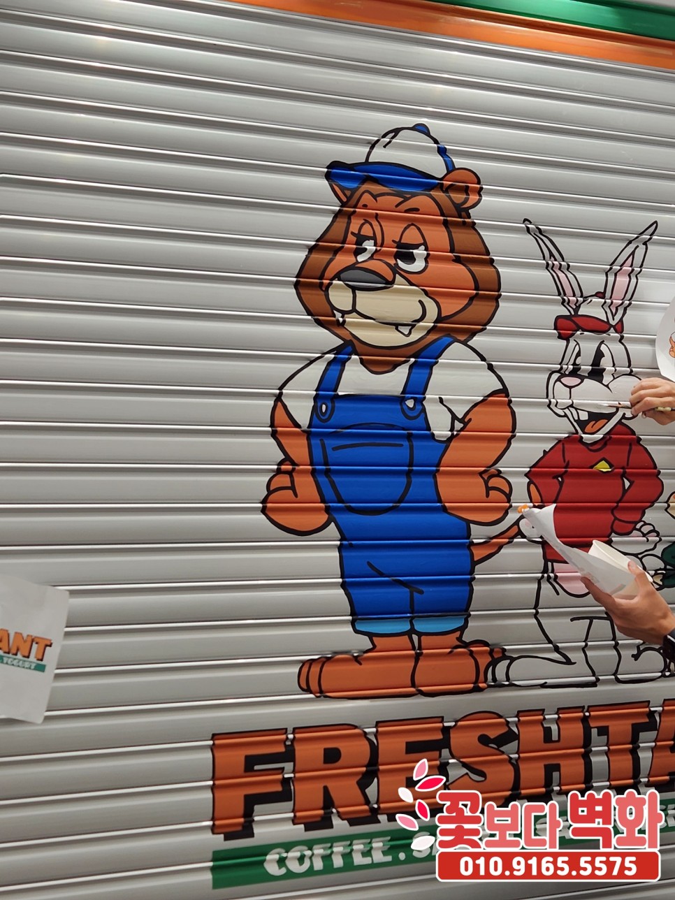 창원 프레시턴트 카페, 셔터에 그려진 로고 스텐실 인테리어벽화 / 로고벽화제작, 깔끔한 포인트벽화