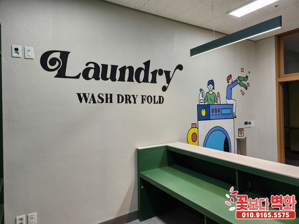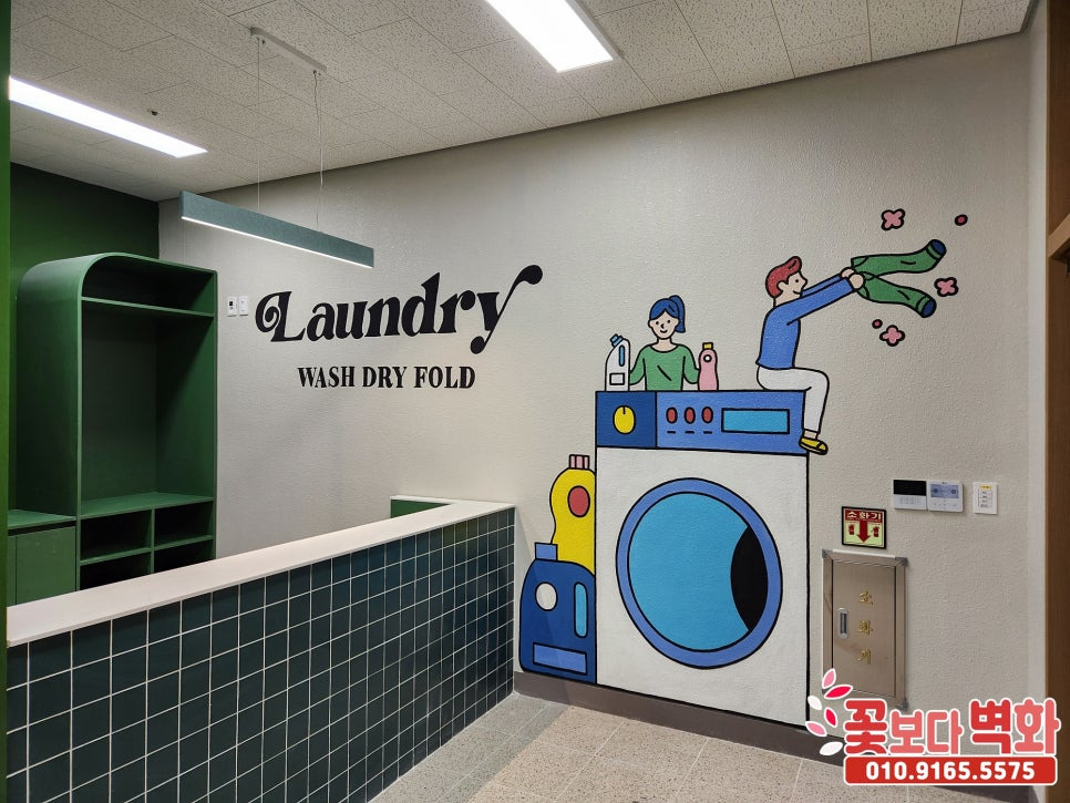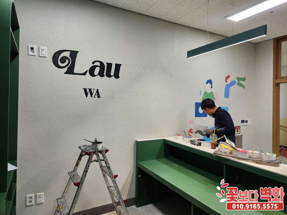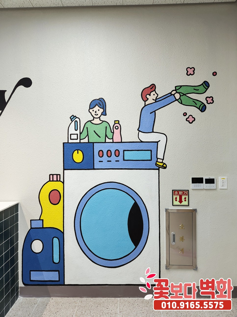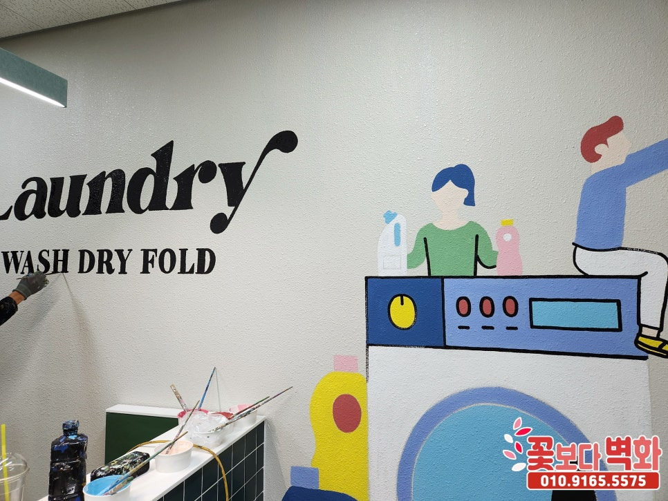 세탁실 벽면에 그림이 그려지고 있습니다.