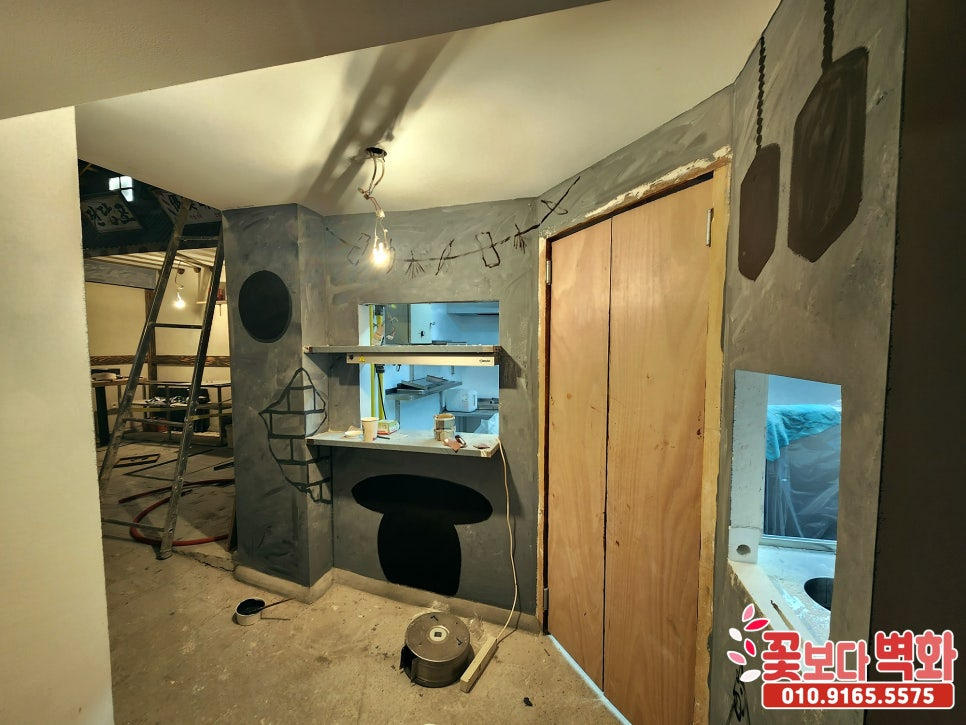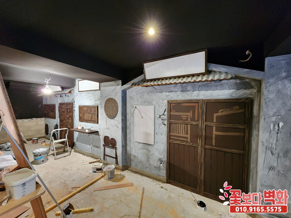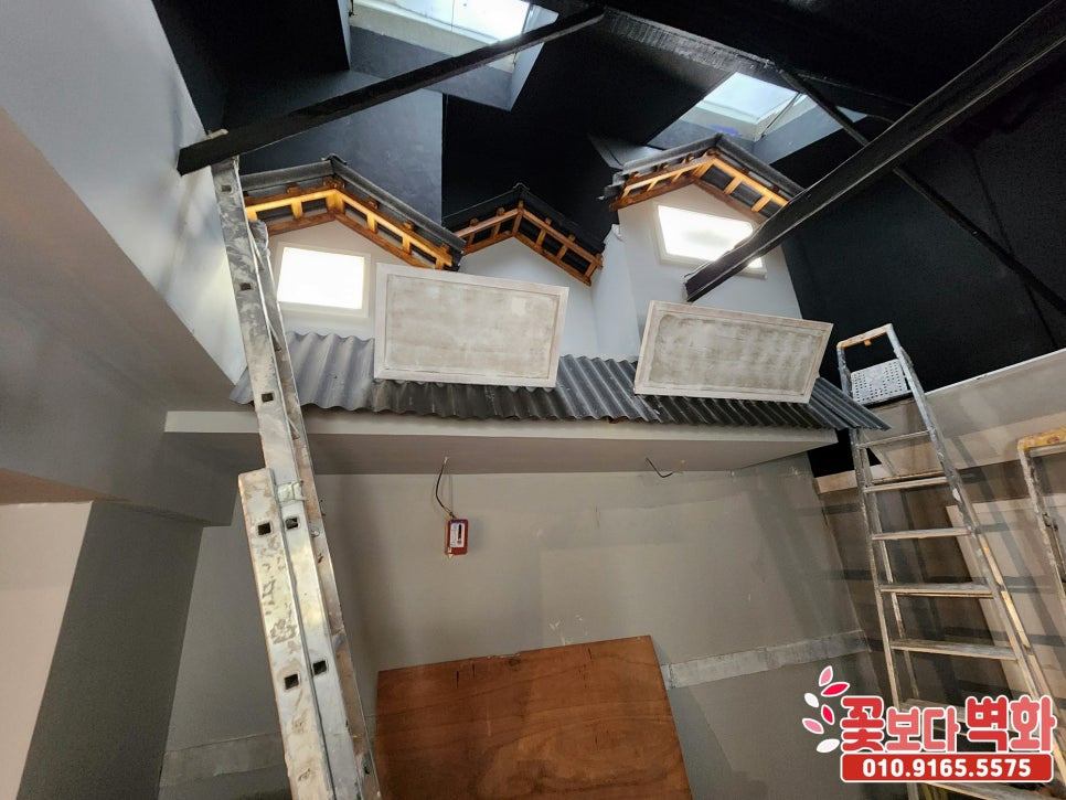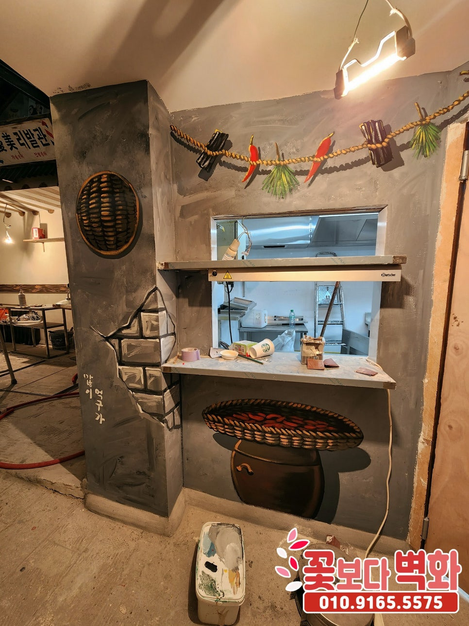 사장님께서 입체적인 벽화를 원하셔서 요청드린대로 문과 창문틀, 지붕, 담벼락까지 잘 만들어 놓으셨어요~