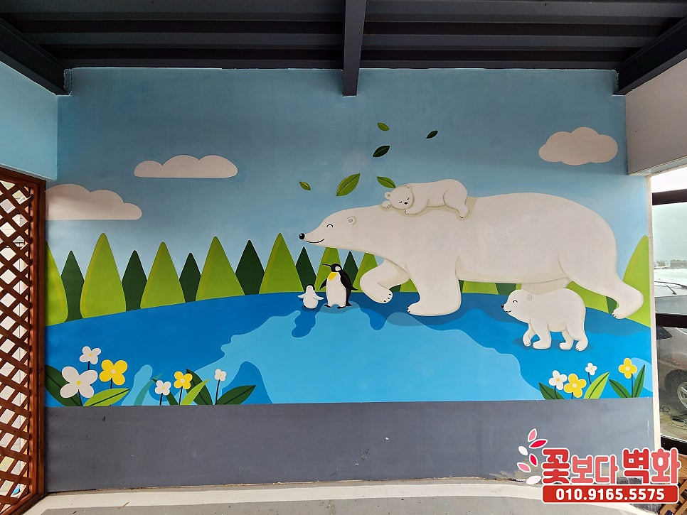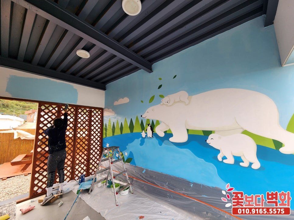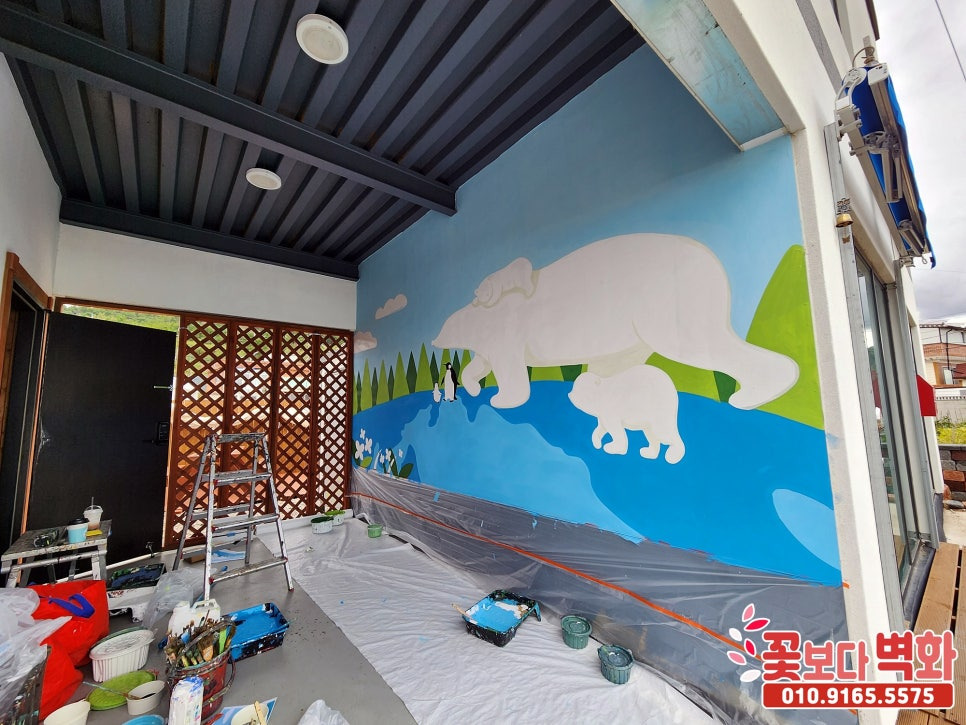 덕 카페 곰바다 귀여운 곰캐릭터 벽화/ 카페벽화, 펜션벽화, 예쁜벽화