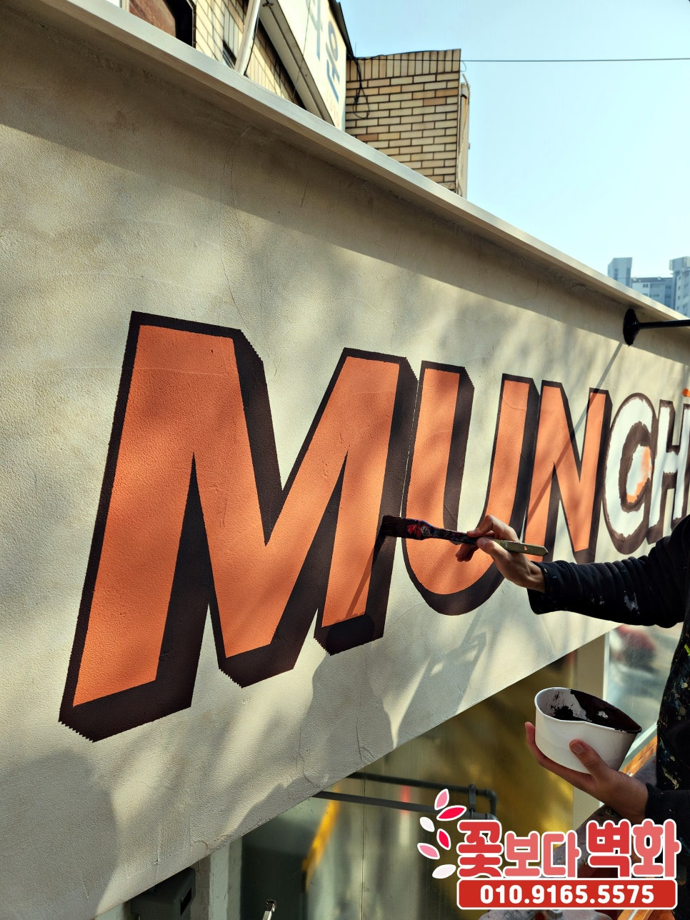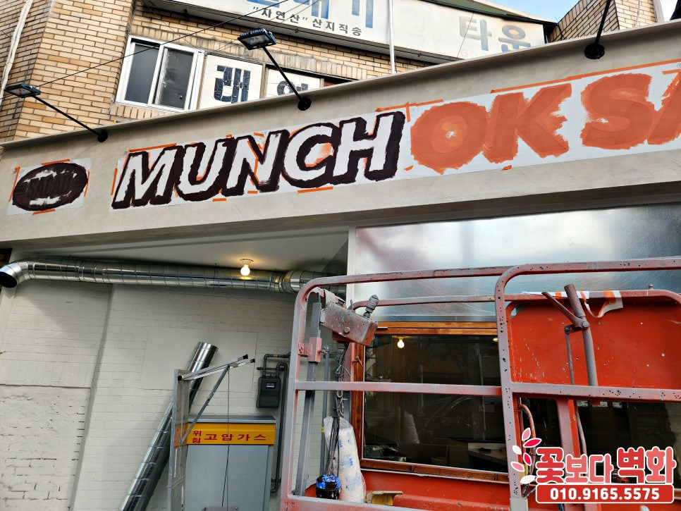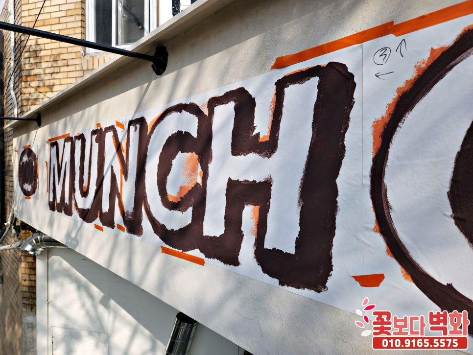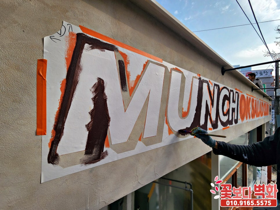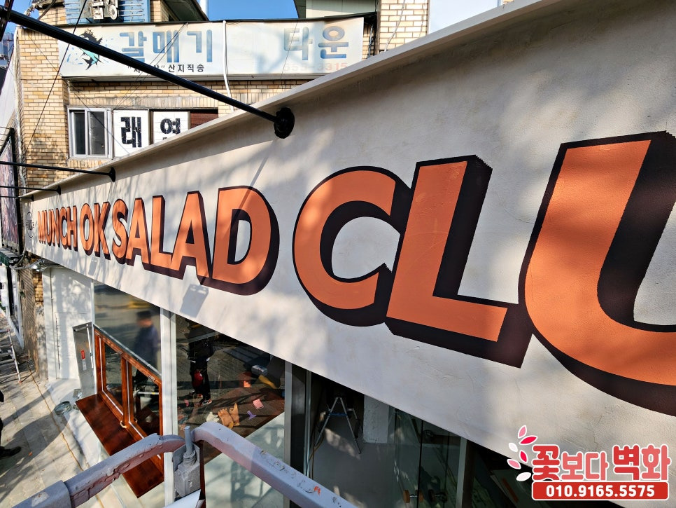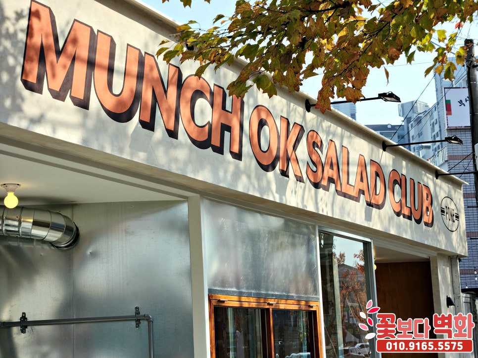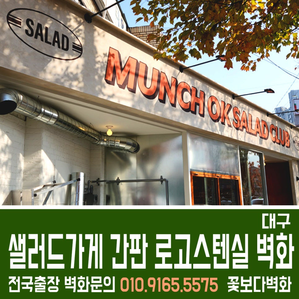 대구 먼치오케이 샐러드클럽 외부 간판 로고 스텐실 간판벽화, 디자인간판, 예쁜간판, 인테리어벽화