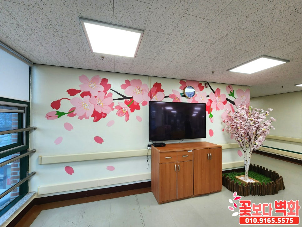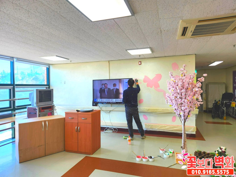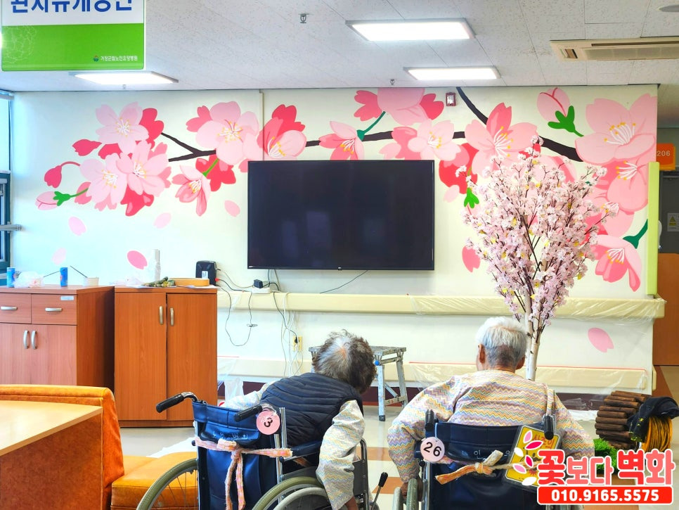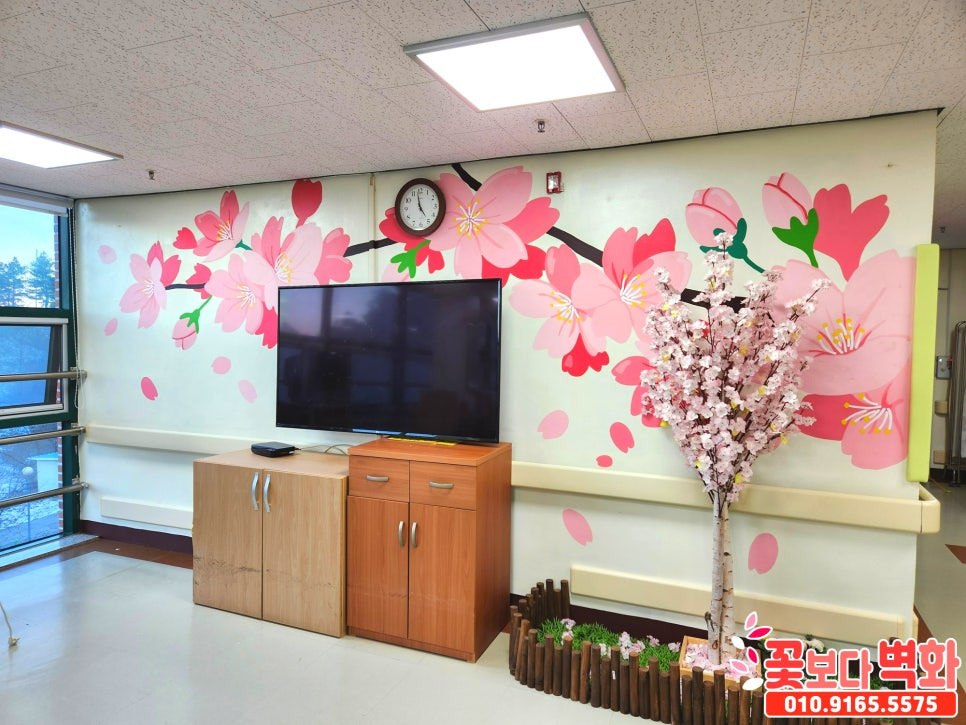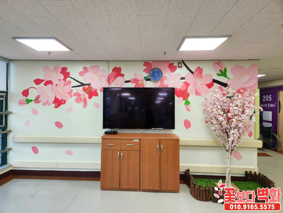 거창 군립 노인요양병원 휴게실 벚꽃 인테리어 벽화시공, 꽃보다벽화, 병원인테리어, 병원벽화