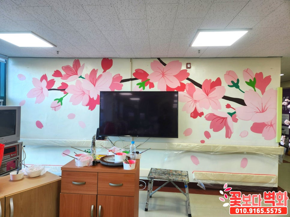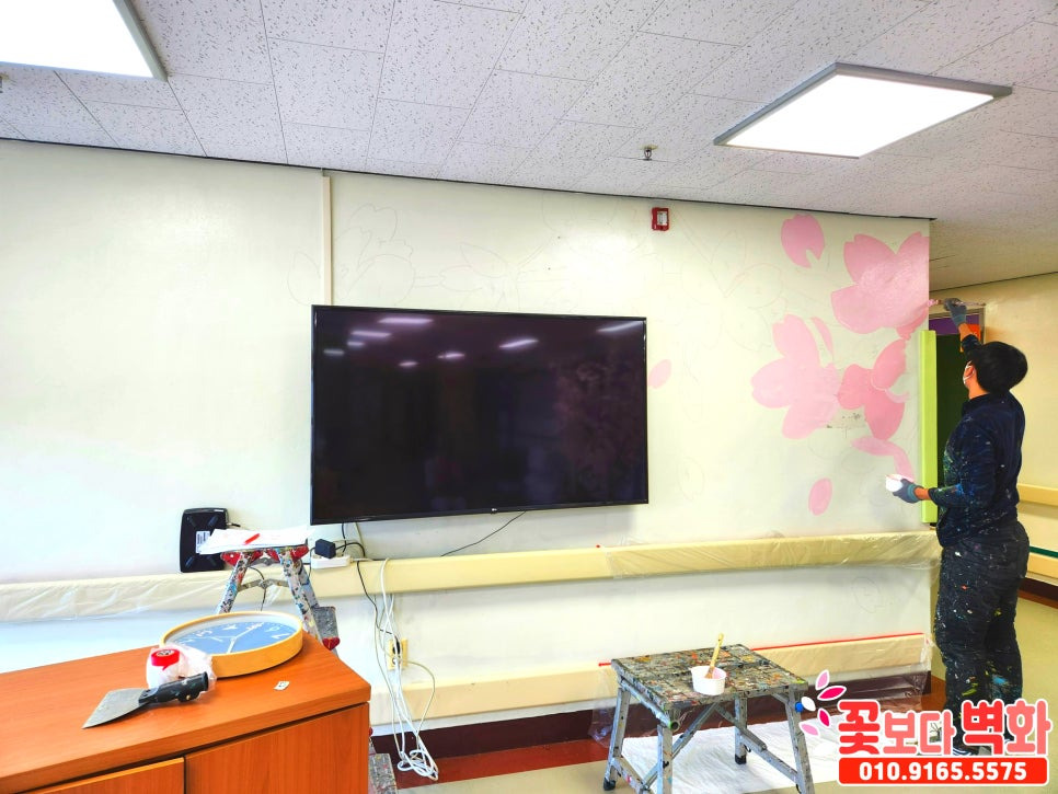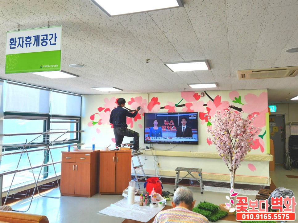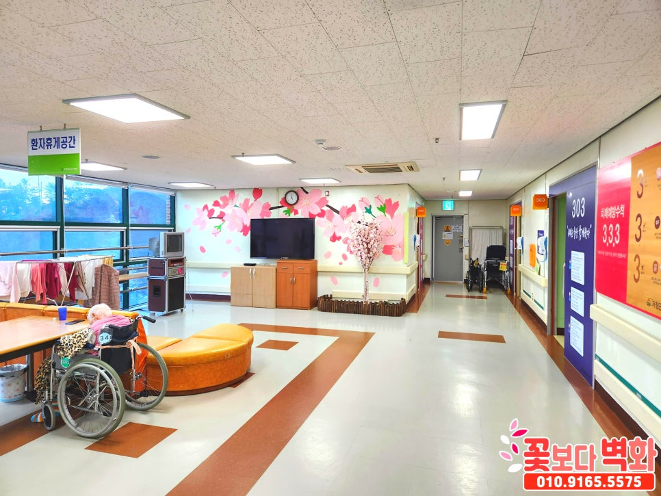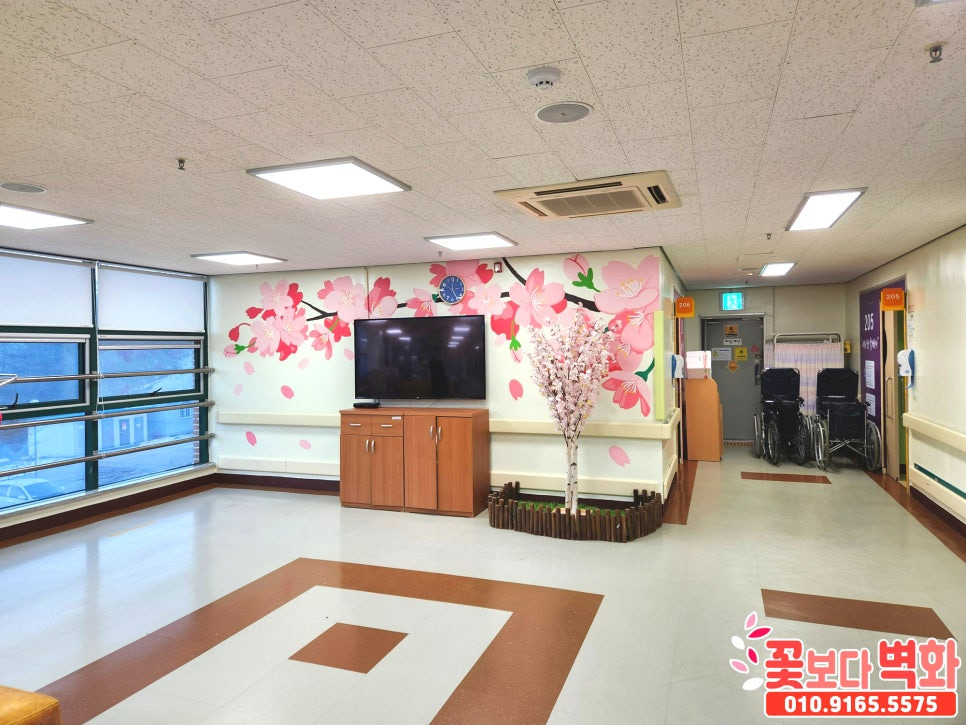 거창 군립 노인요양병원 휴게실 벚꽃 인테리어 벽화시공, 꽃보다벽화, 병원인테리어, 병원벽화