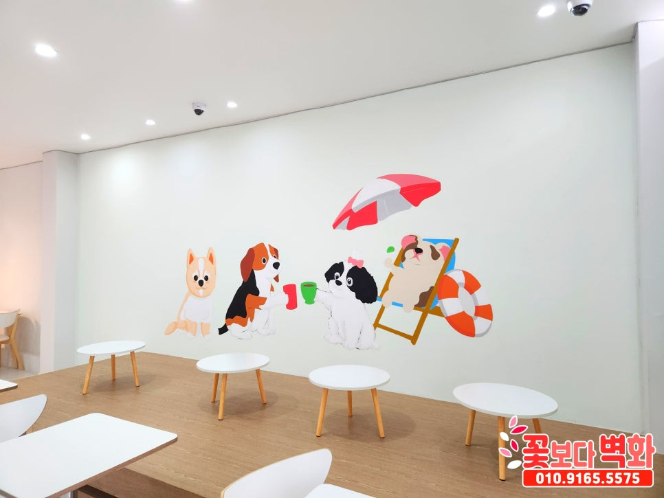 부산 모어스테이 애견카페 인테리어 벽화 시공, 예쁜 강아지들 그림