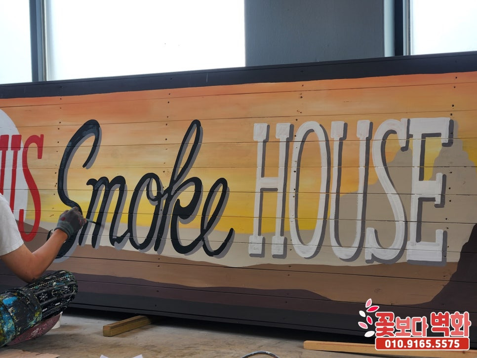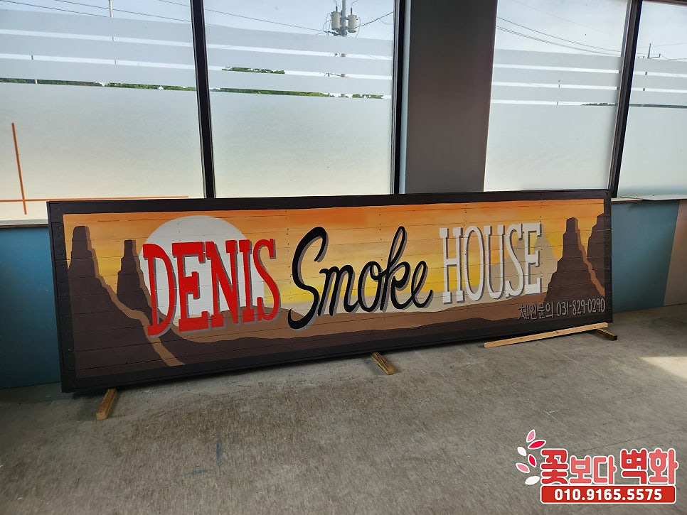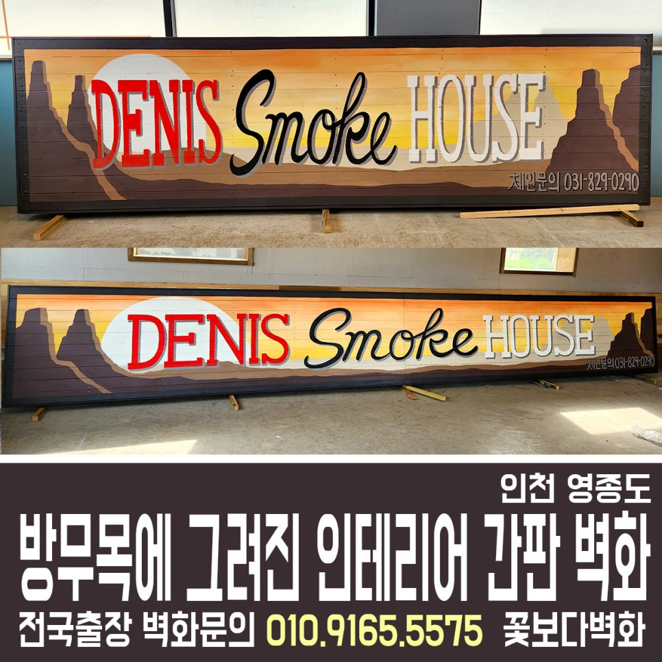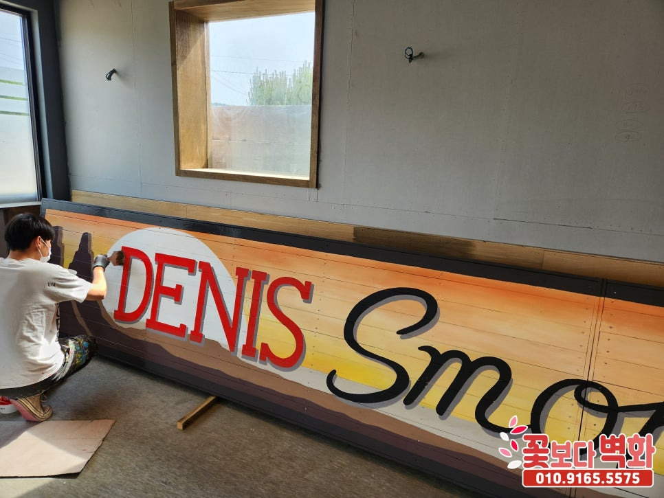 인천 영종도 '데니스 스모크 하우스' 방부목 간판에 그려진 인테리어 벽화/ 간판 스텐실, 예쁜간판
