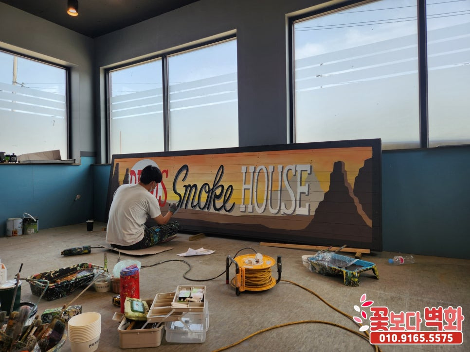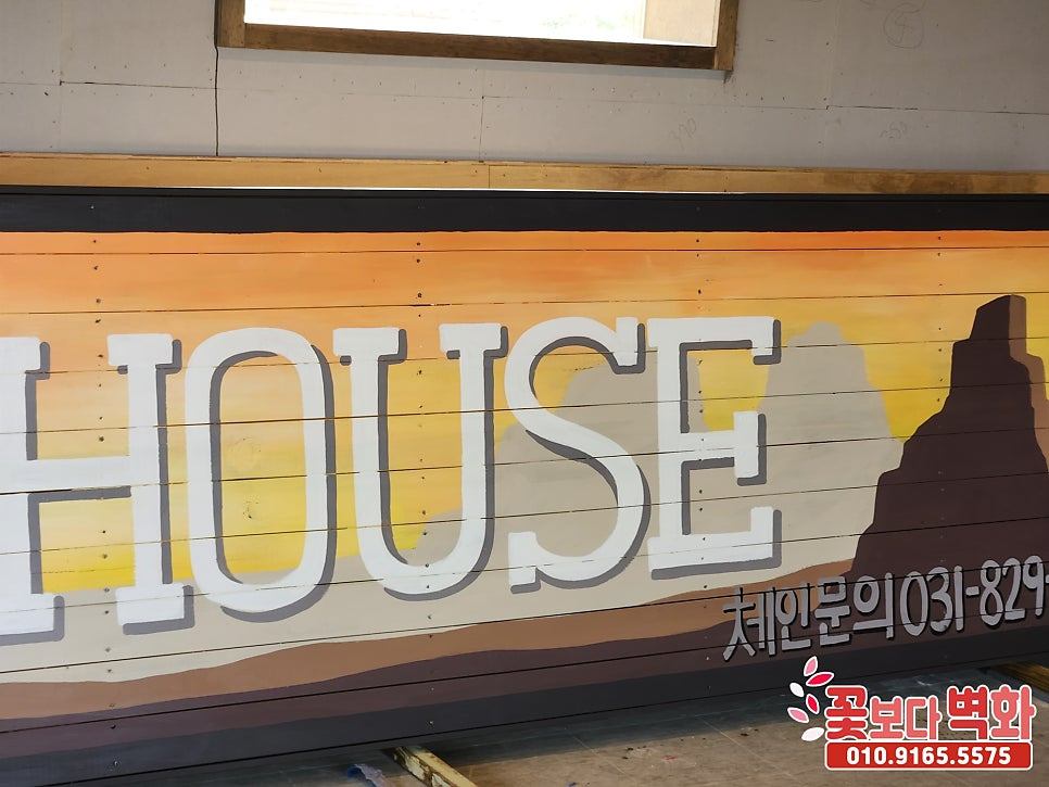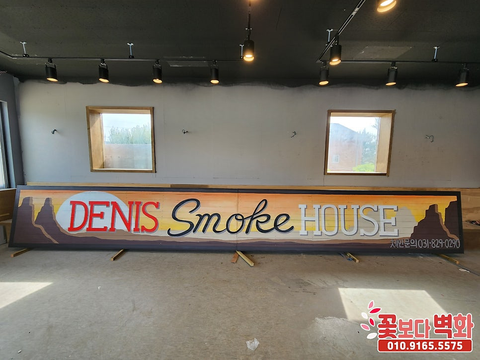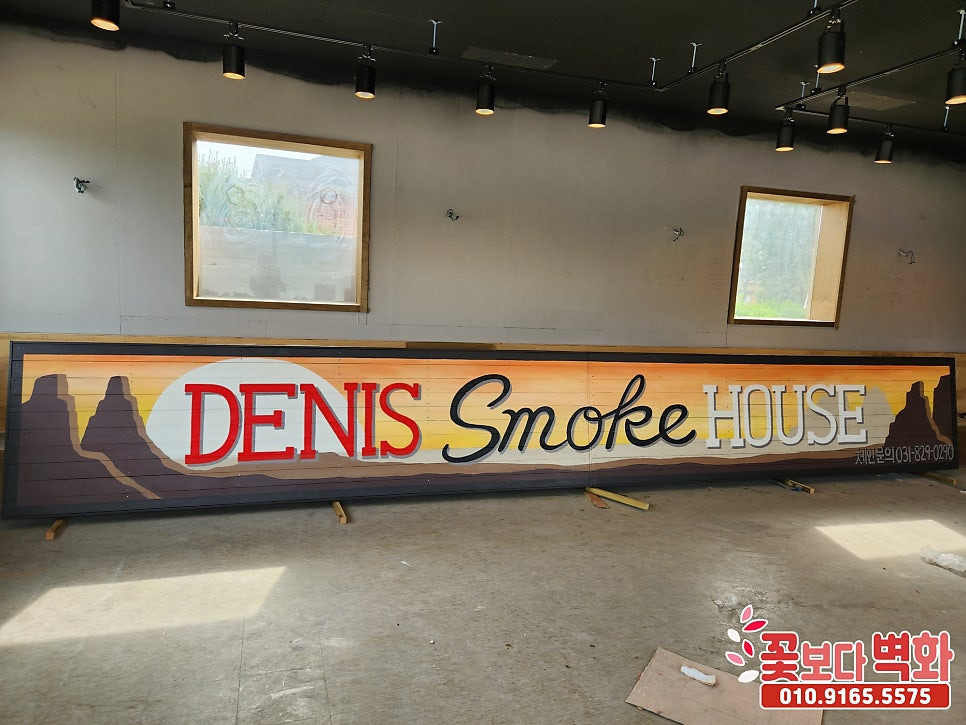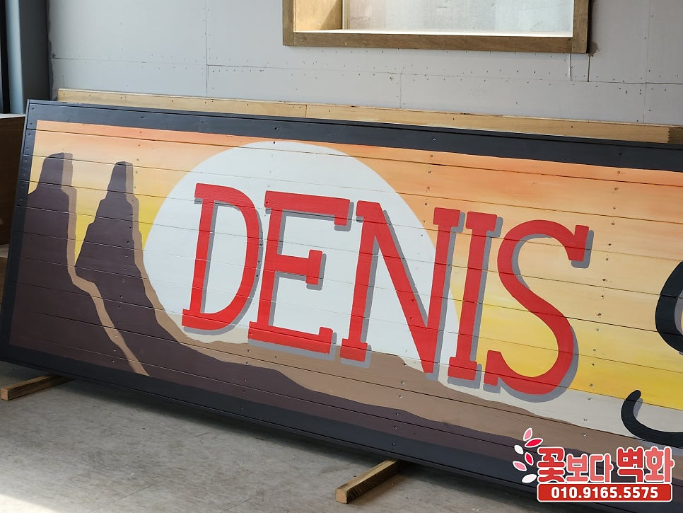 인천 영종도 '데니스 스모크 하우스' 방부목 간판에 그려진 인테리어 벽화/ 간판 스텐실, 예쁜간판