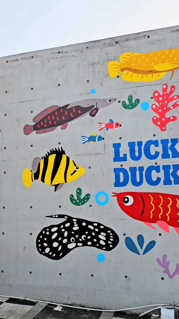 왜관 러키더키 아쿠아리움 외벽 물고기 캐릭터 벽화, 수족관 인테리어 대형벽화 시공