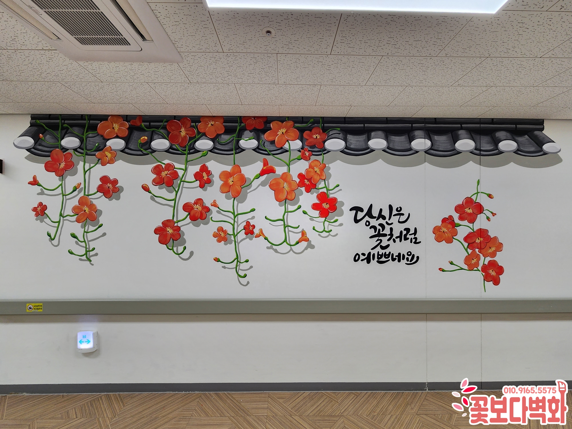 그중 첫 번째로 복도에 그려질 꽃과 기와, 캘리그라피가 있는 벽화입니다.