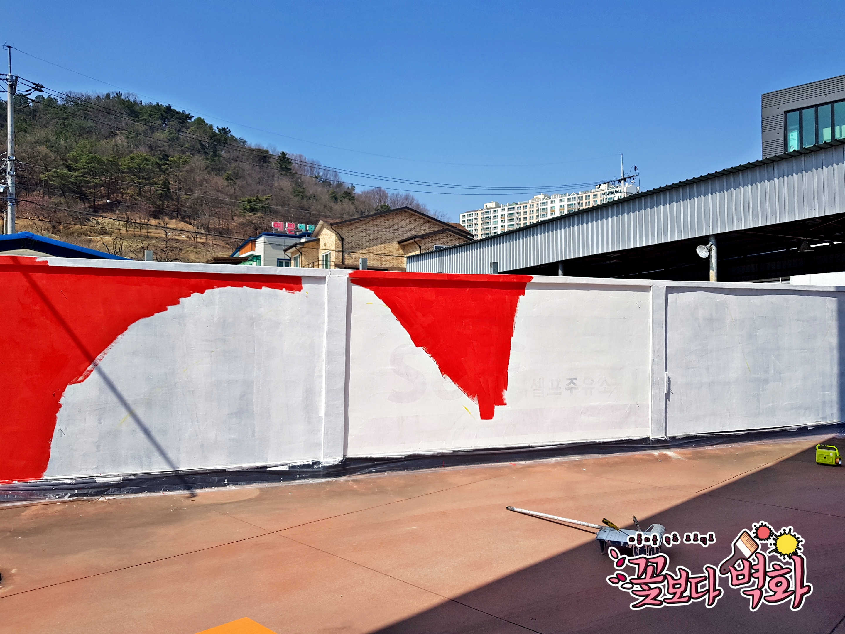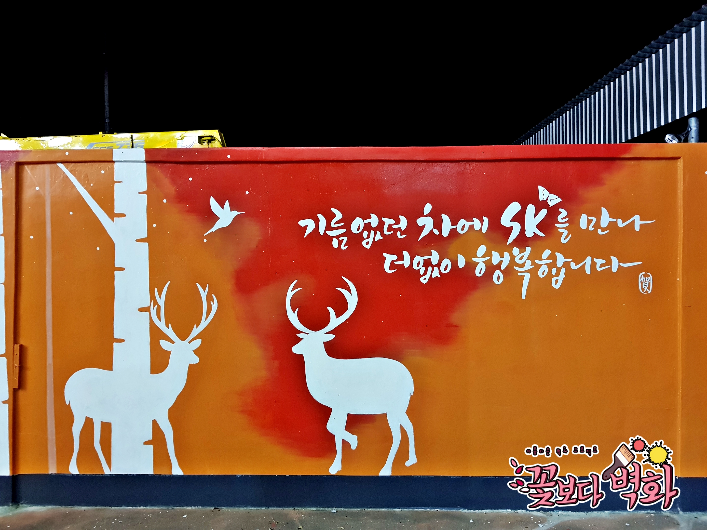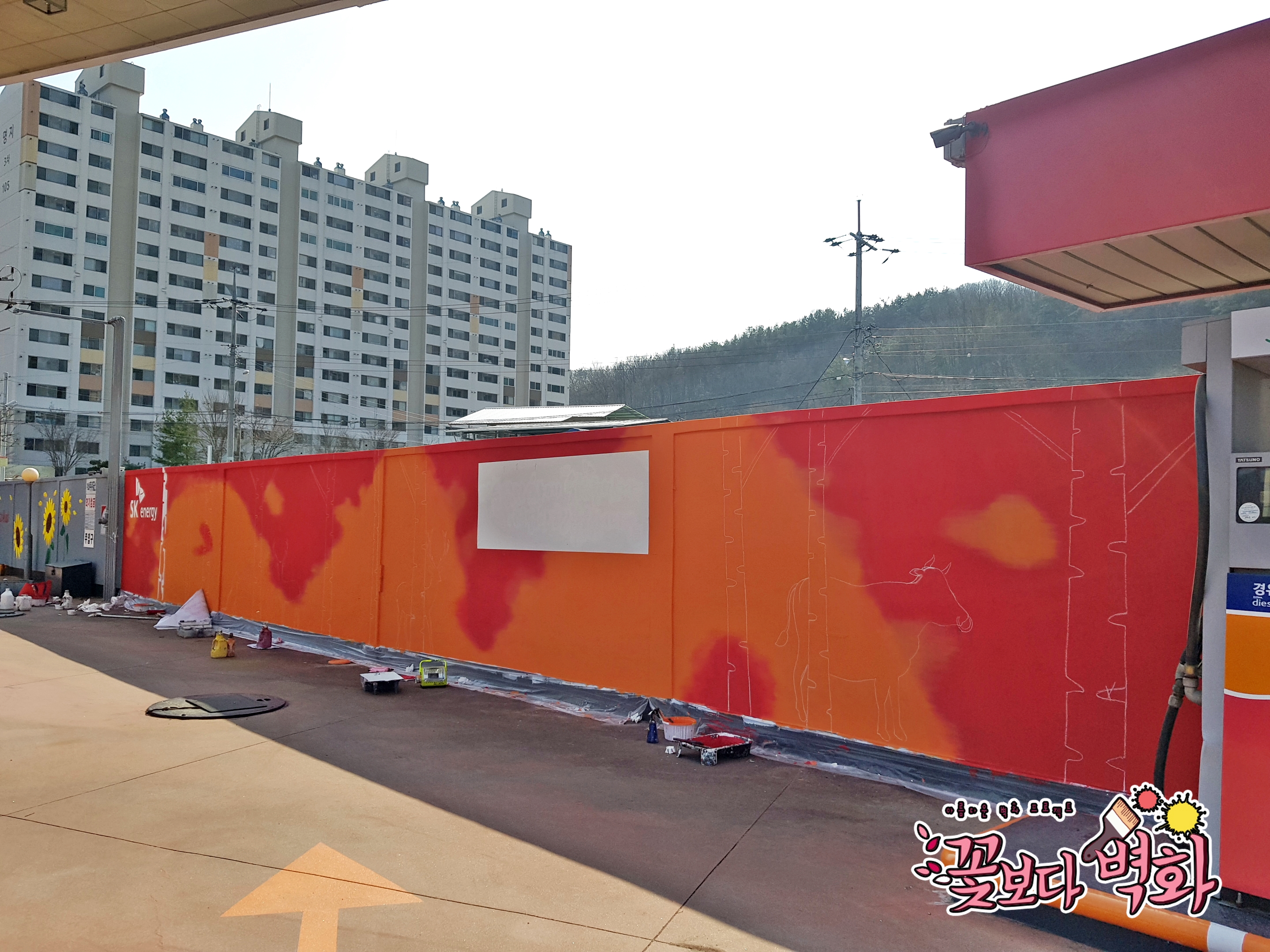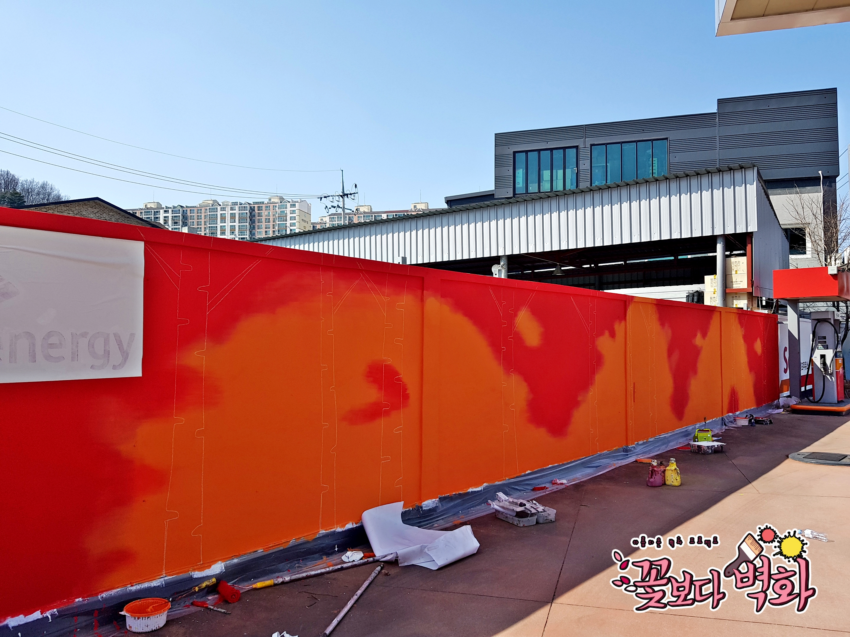 sk주유소 시그니처 색을 이용한 벽화 왼쪽에 빈 공간에는