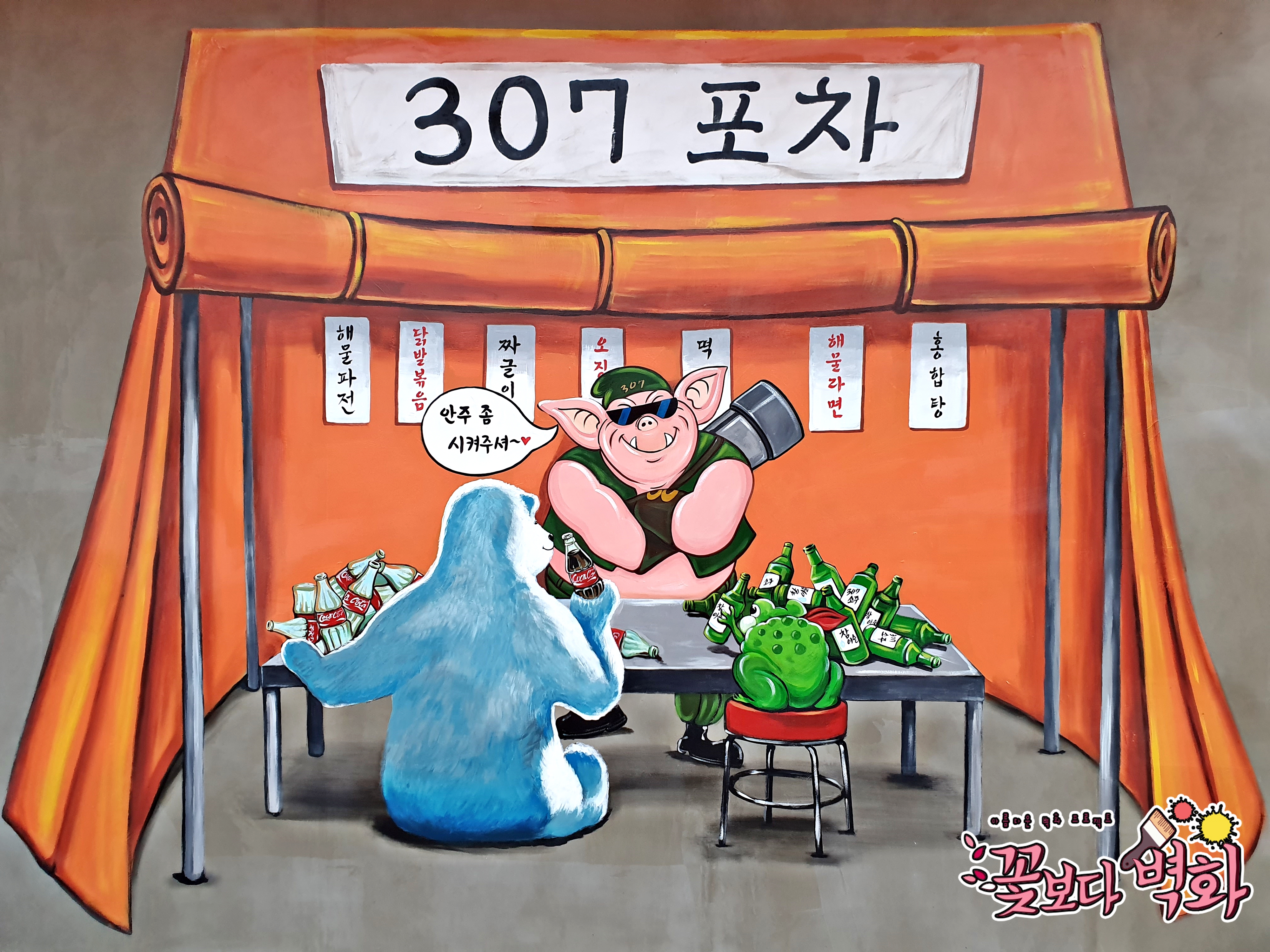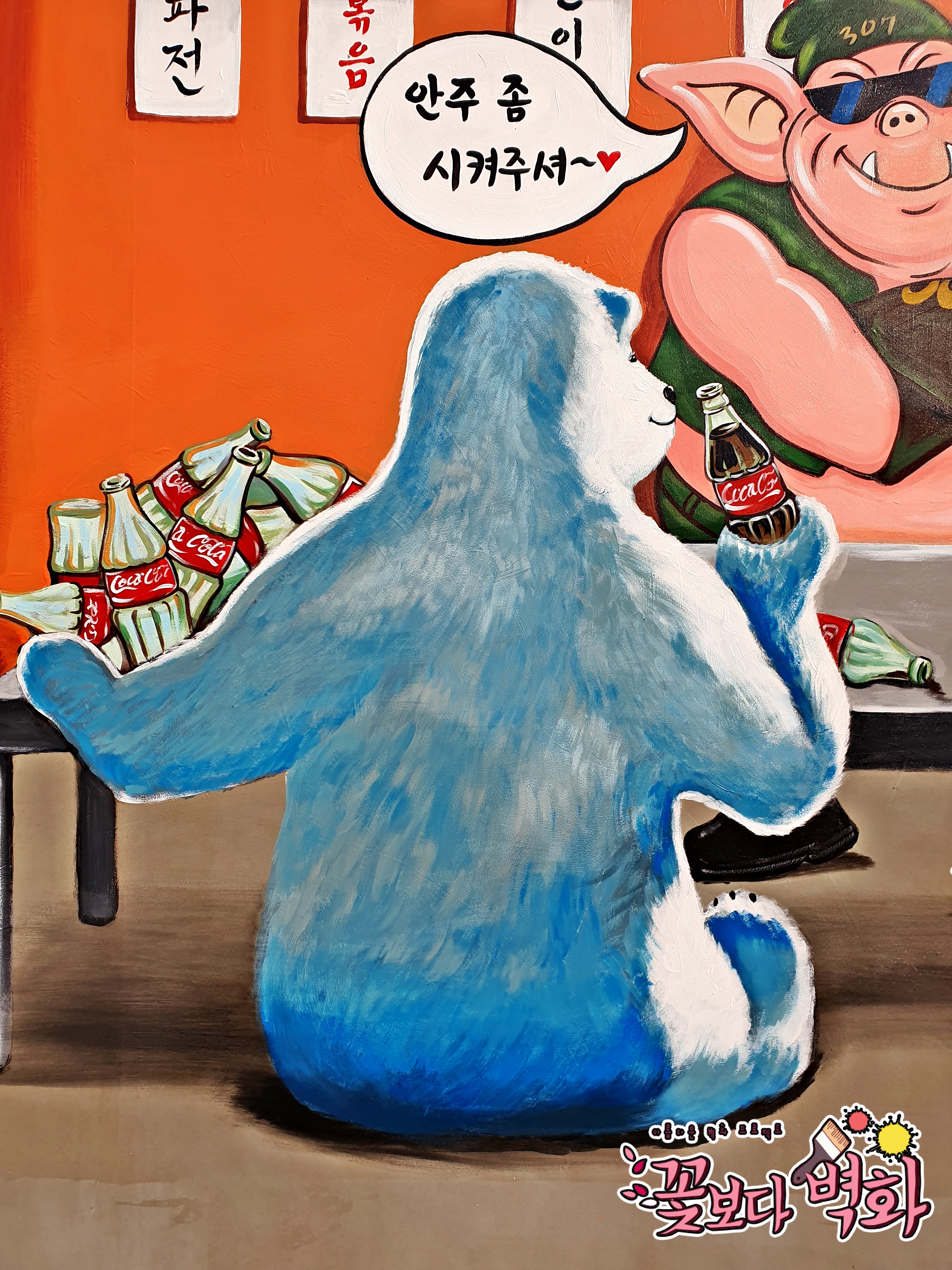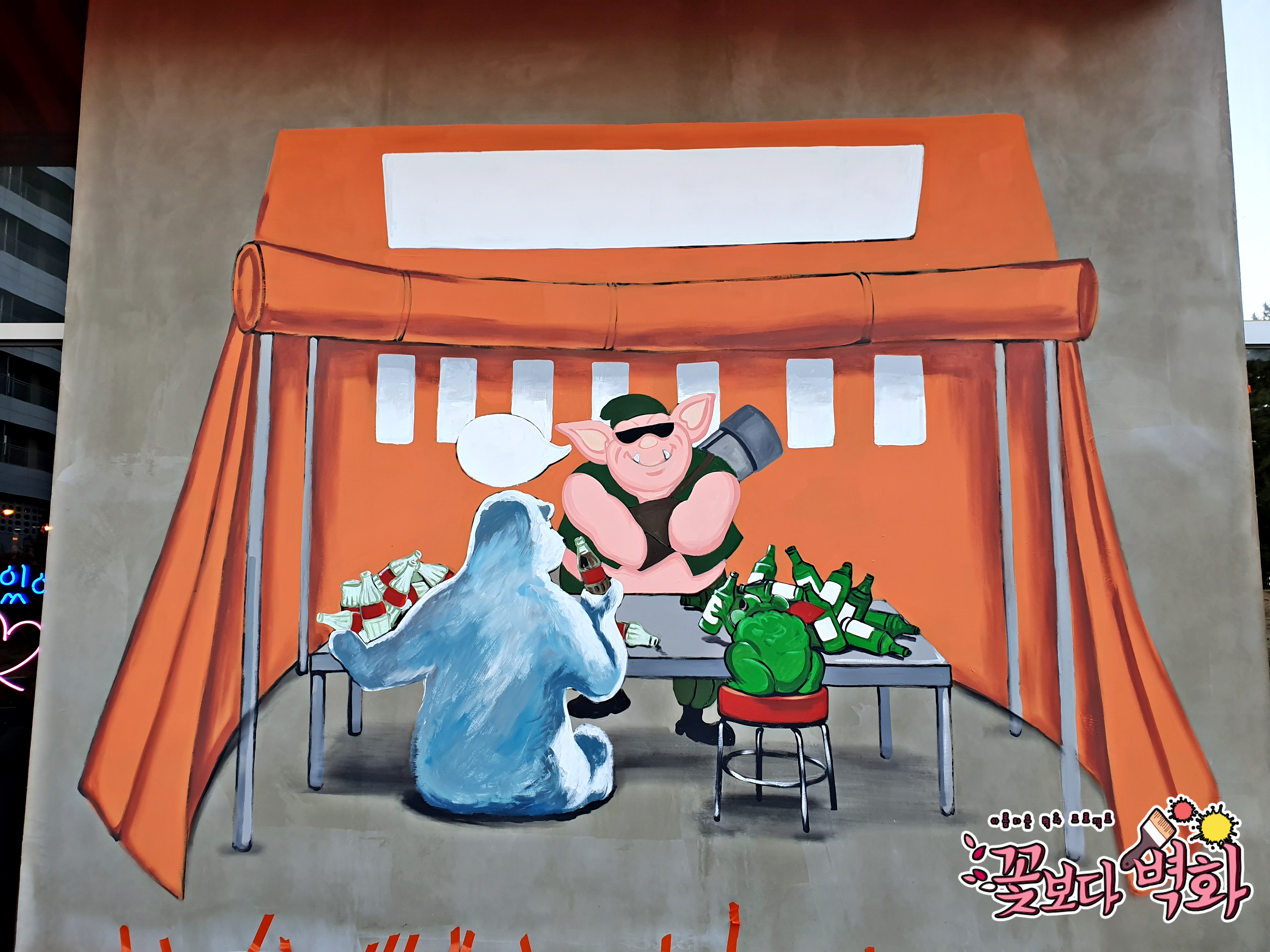 앞에서는 북금곰과 두꺼비가 손님으로 각자 콜라, 소주를 병째로 비워버리는 아주 재미난 스토리가 있는 벽화가 탄생하였습니다^^