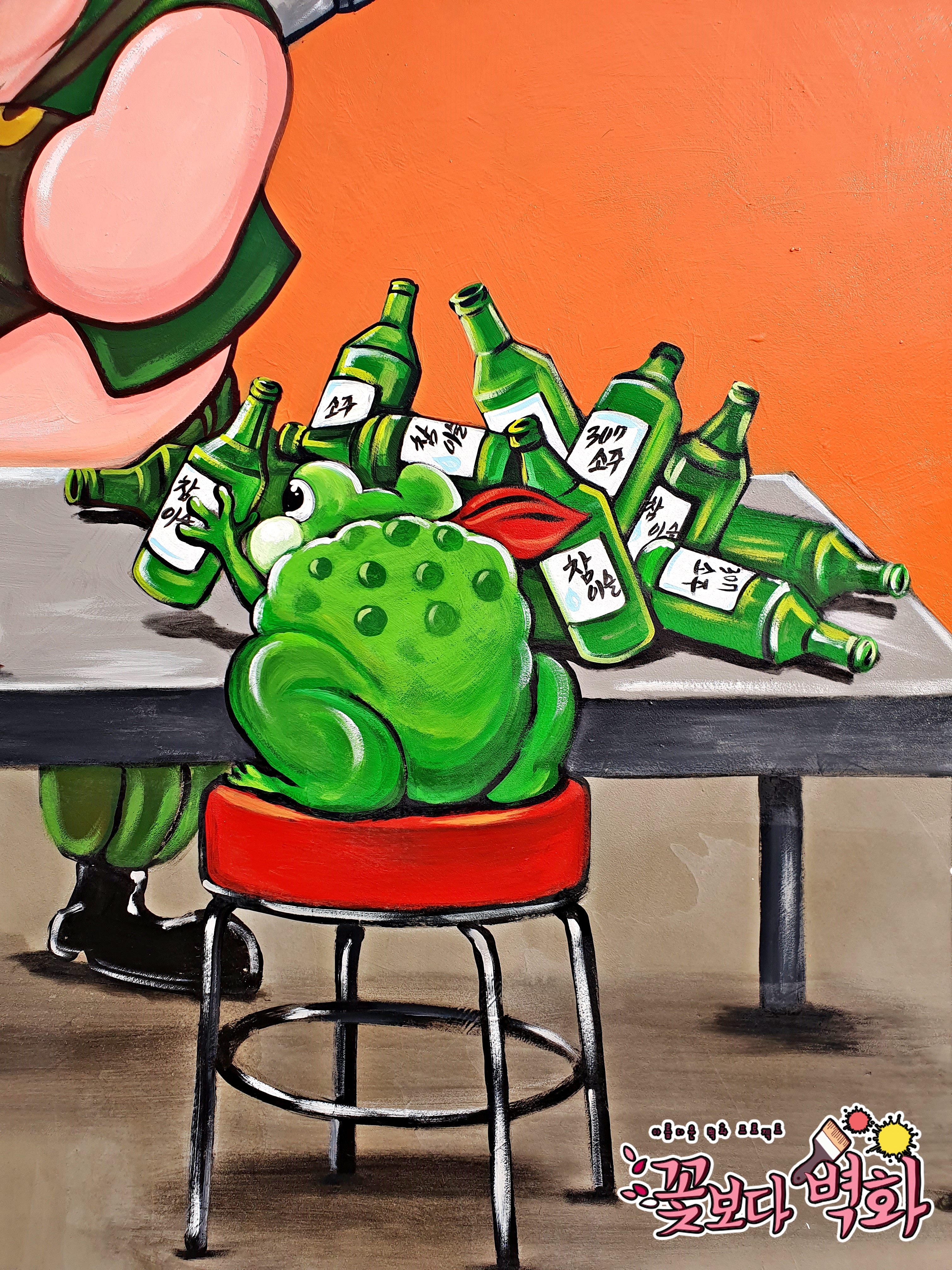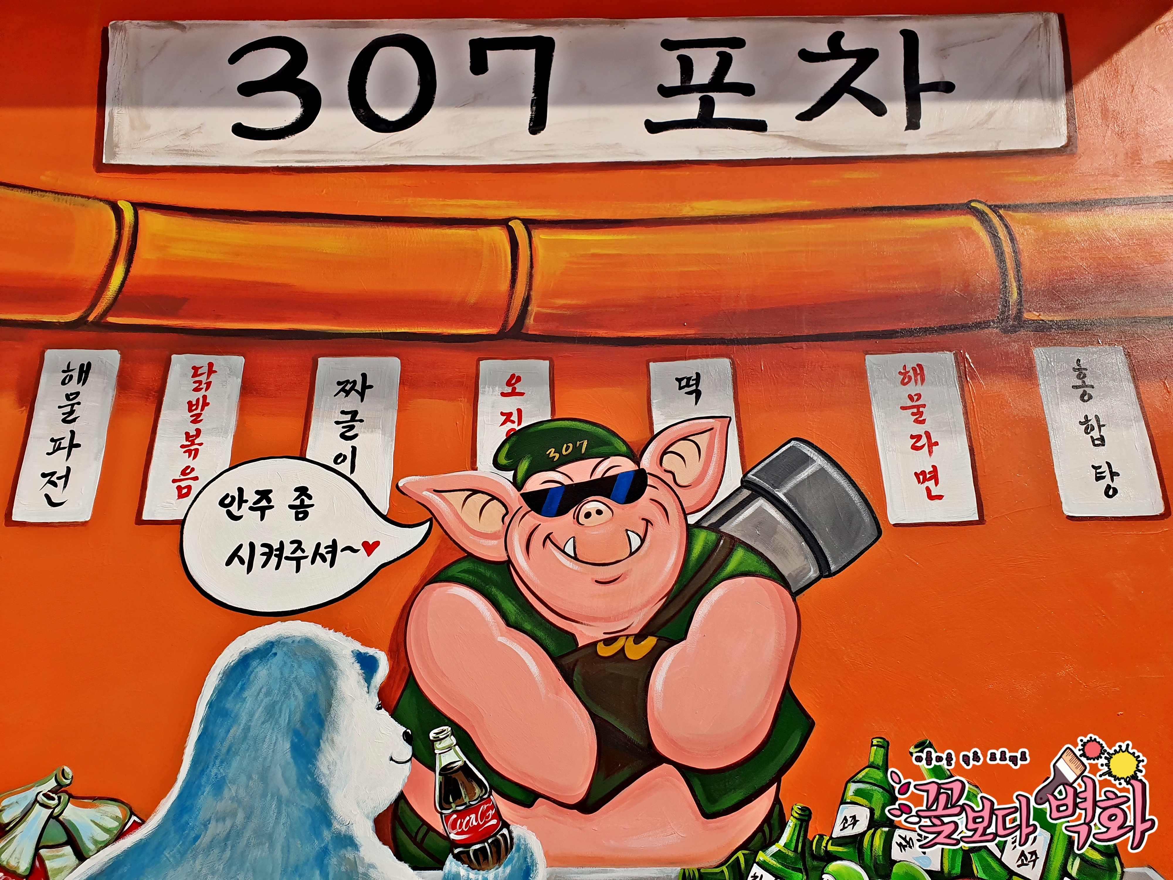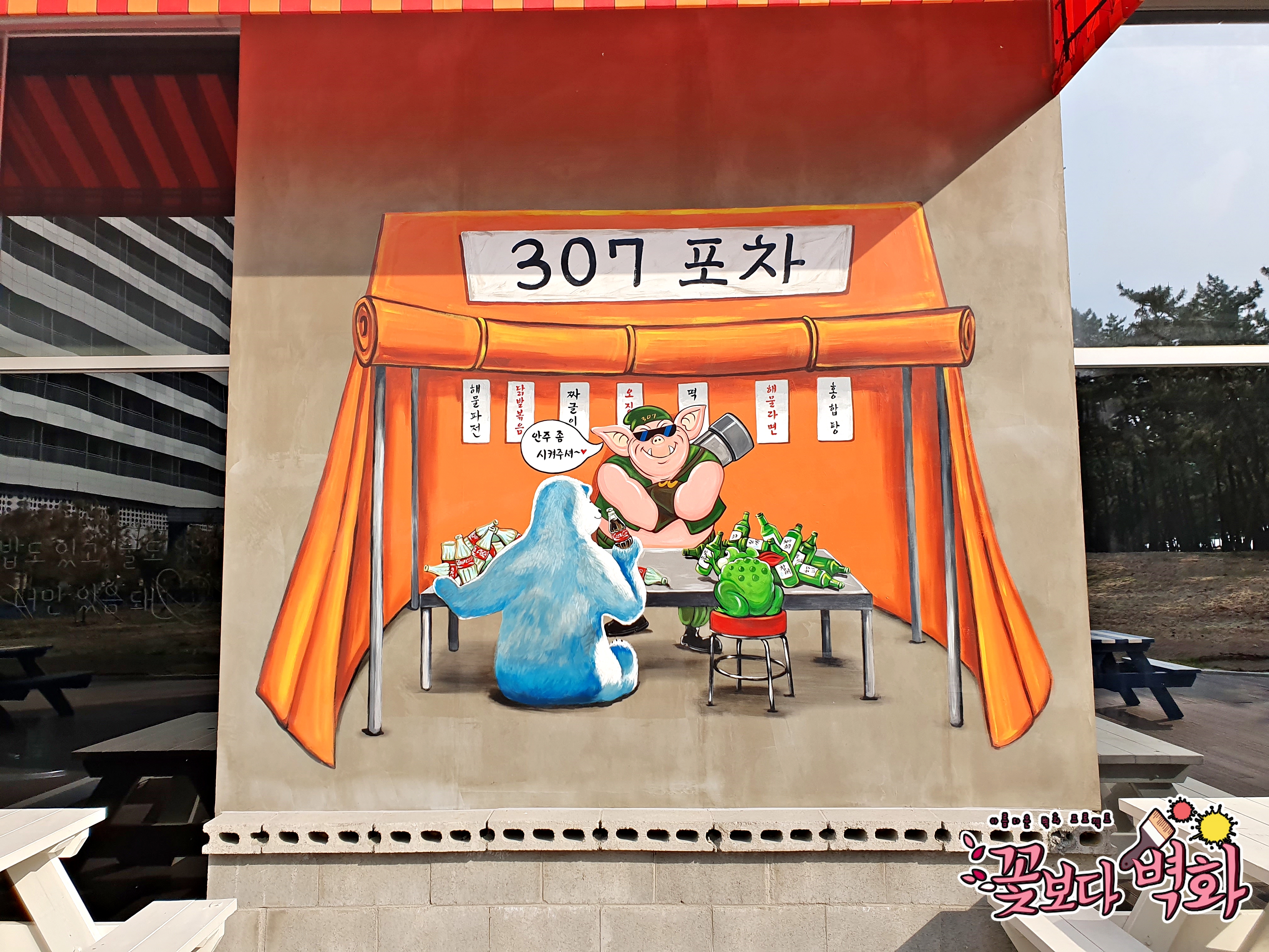 앞에서는 북금곰과 두꺼비가 손님으로 각자 콜라, 소주를 병째로 비워버리는 아주 재미난 스토리가 있는 벽화가 탄생하였습니다^^