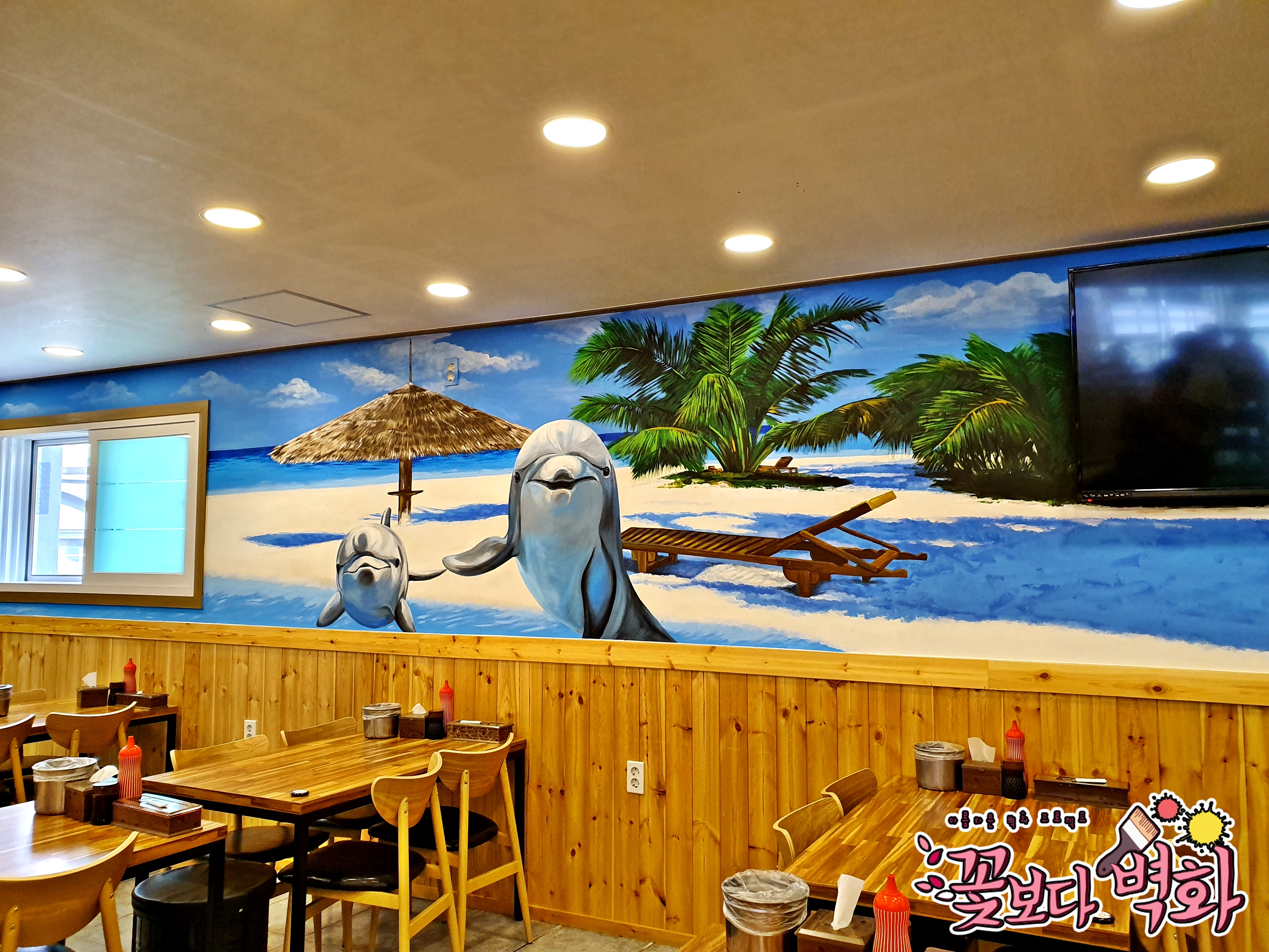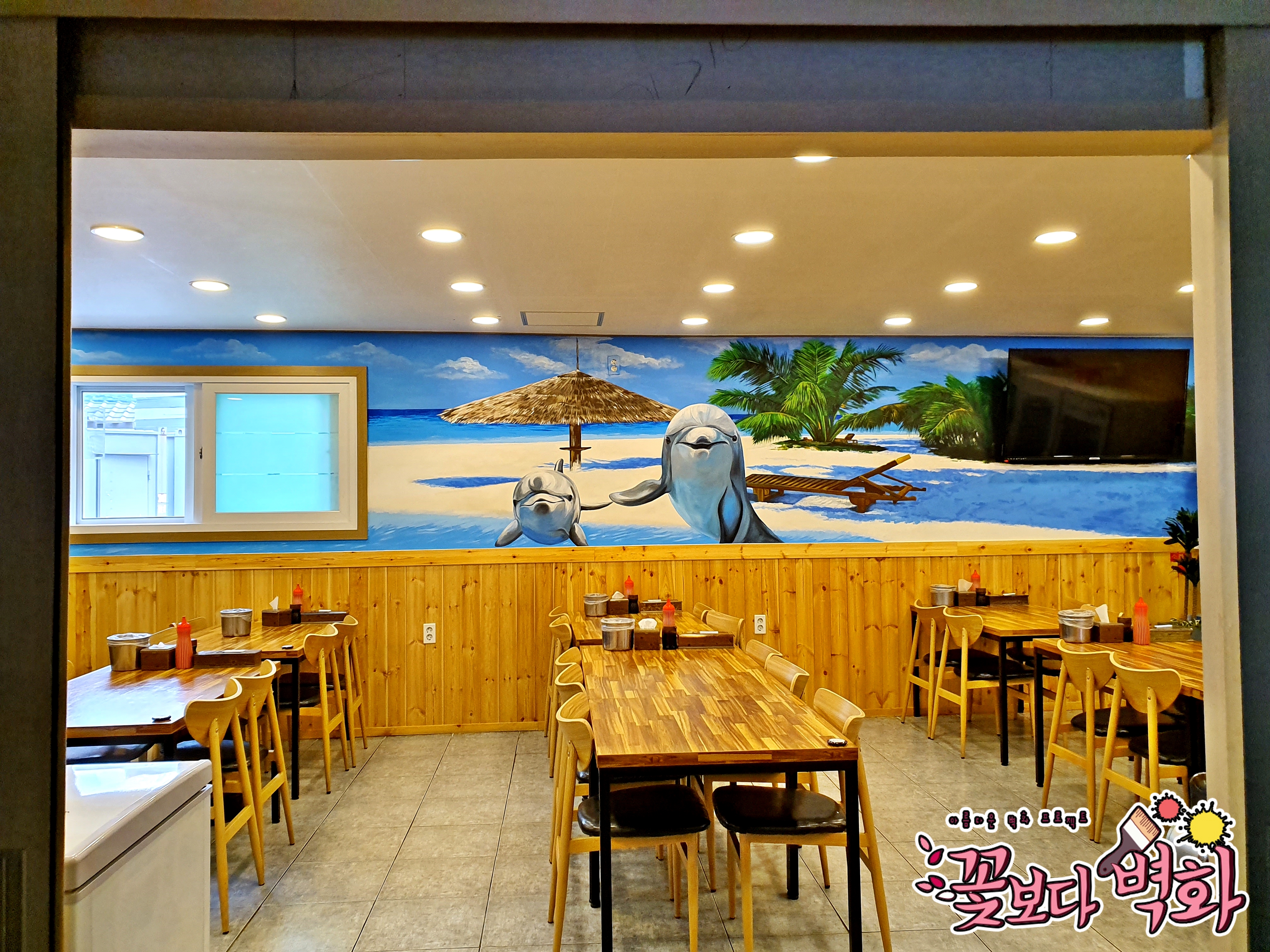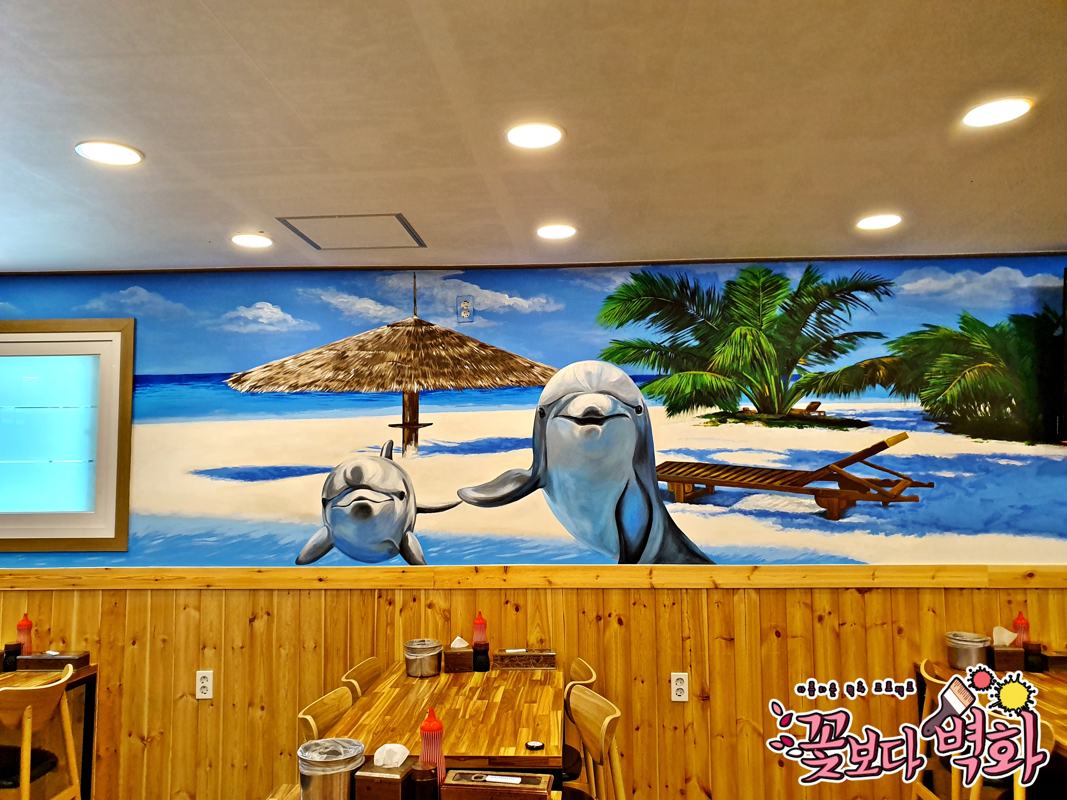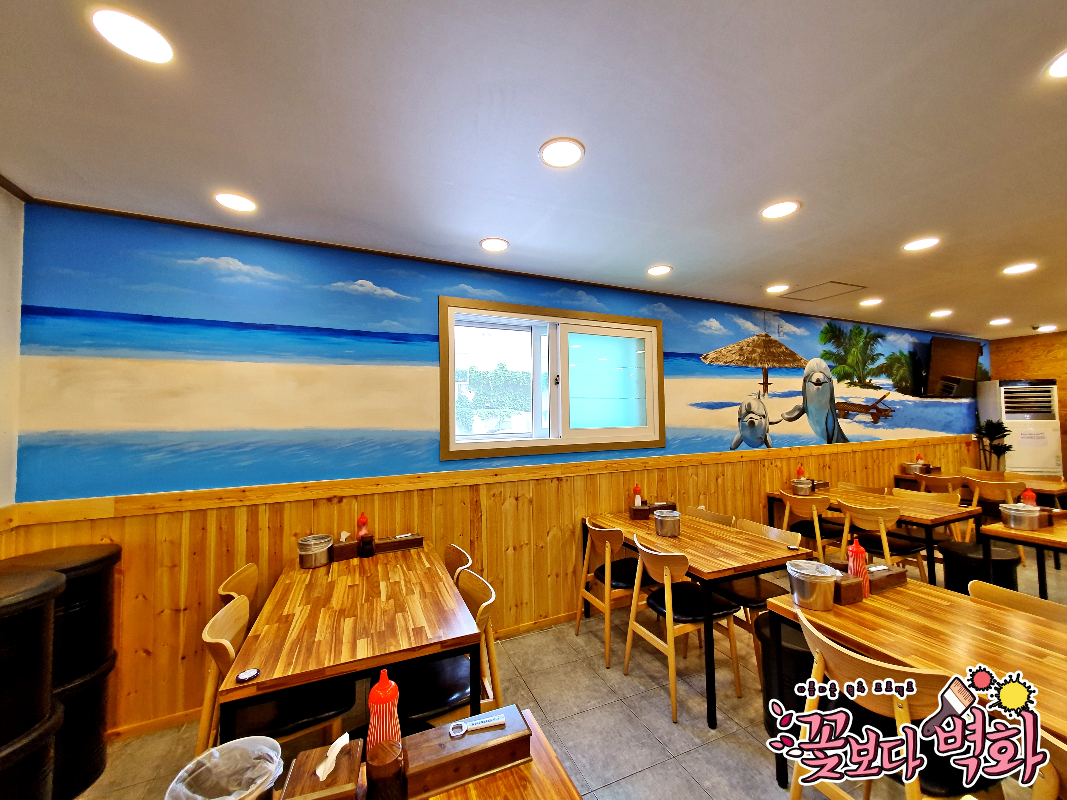 횟집에 너무나도 잘 어울리는 해변벽화가 탄생하였습니다.