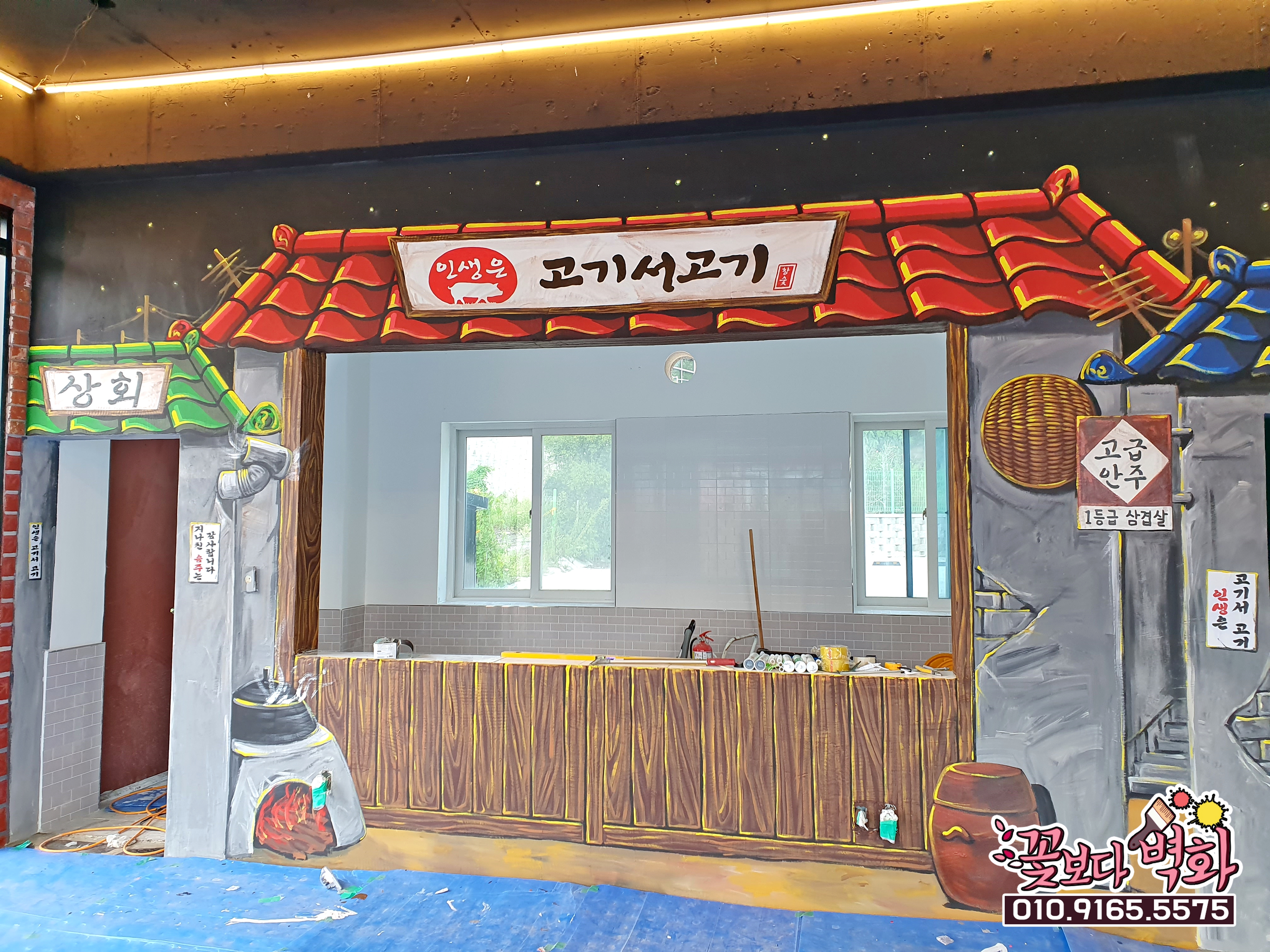 광주 마륵동에 위치한 인생은 고기서고기 고깃집 복고 벽화입니다.